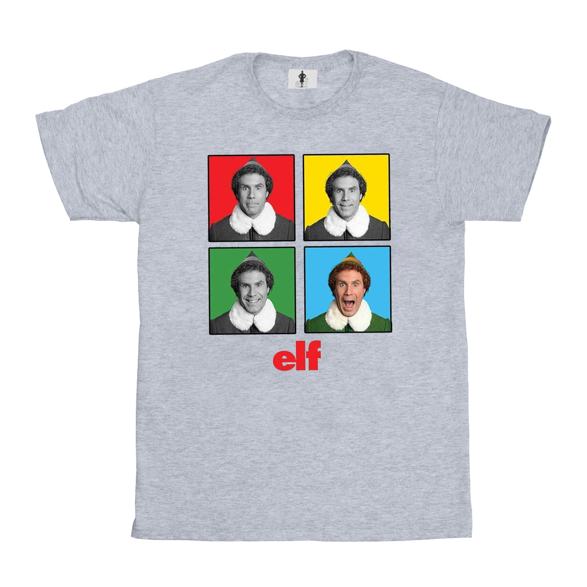 Questa T-shirt presenta un divertente design pop art di Buddy l'elfo del film "Elf". La grafica mostra quattro diverse espressioni di Buddy in quadrati colorati, rendendola un'aggiunta giocosa a qualsiasi guardaroba.