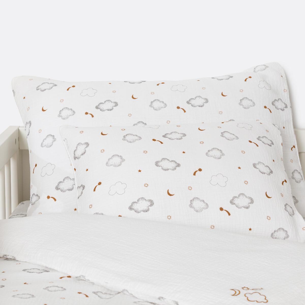 Questa fodera per cuscino neonato è realizzata in morbida garza di cotone, offrendo una superficie delicata e confortevole per la pelle sensibile. La sottile trama a nido d'ape rende superflua la stiratura. Il design presenta un affascinante motivo di nuvole e stelle cadenti, creando un'atmosfera serena e sognante.