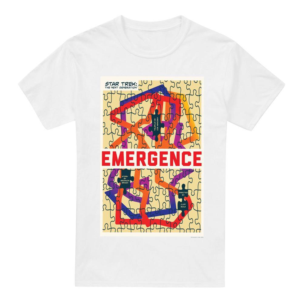 Questa T-shirt presenta una stampa grafica ispirata a "Star Trek: The Next Generation" Stagione 7, Episodio 23, intitolato "Emergence". Il design mostra un motivo colorato a forma di puzzle con vari elementi dell'episodio, rendendola un pezzo distintivo per i fan.