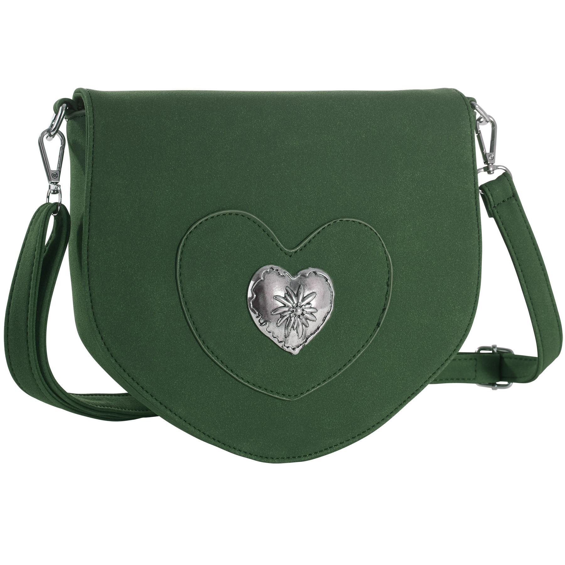 La borsetta Alpenglühn è tanto una graziosa attrazione, quanto una pratica compagna. L'accessorio in tinta unita dall'effetto pelle scamosciata con morbida superficie in velours incanta per il suo inserto cucito in applicazione a forma di cuore. Questo è impreziosito da un luccicante cuore in metallo con al centro una figura di stella alpina. L'interno è sufficientemente capiente per contenere cellulare, chiavi e portafoglio. All'insegna della praticità è lo scomparto laterale con cerniera lampo. La borsa a tracolla si chiude con un bottone magnetico a pressione. La tracolla staccabile è regolabile in lunghezza ed è così in grado di adattarsi perfettamente a qualsiasi corporatura e altezza.