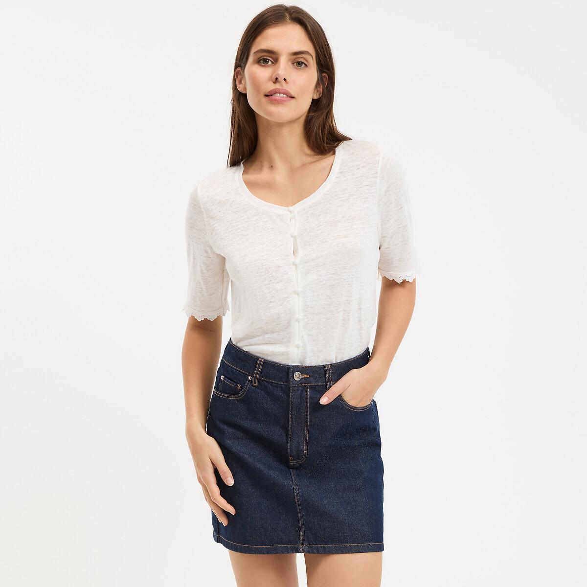 T-shirt a maniche corte in morbido jersey di lino con abbottonatura e orlo decorativo sulle maniche. È rifinito con un delicato bordo in pizzo guipure.