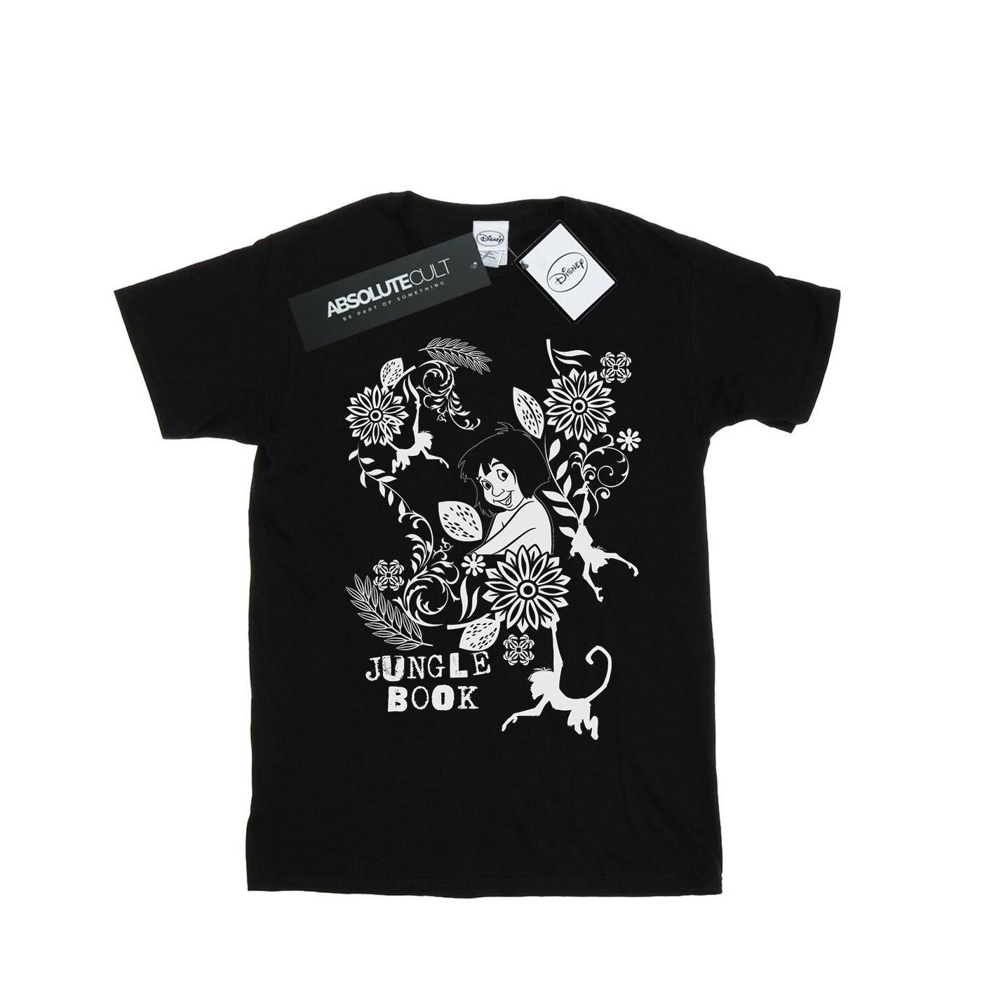 Questa T-shirt presenta un design accattivante ispirato a Il Libro della Giungla della Disney. La grafica mostra Mowgli circondato da intricati motivi floreali e scimmie giocose, catturando lo spirito avventuroso del classico racconto.