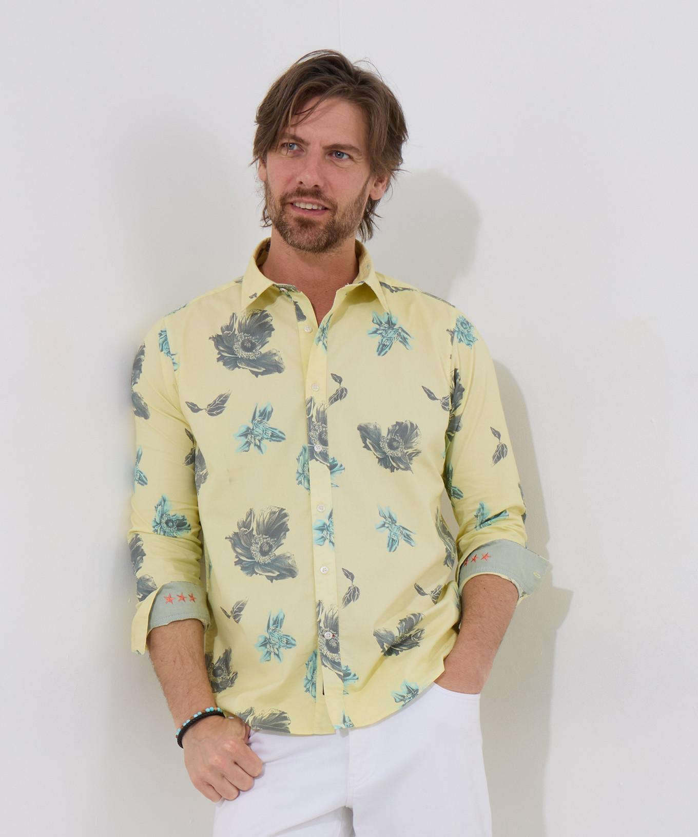 Questa camicia a maniche lunghe presenta un accattivante ricamo floreale, offrendo un look distintivo ed elegante. Il design include un colletto classico e un'abbottonatura a tutta lunghezza per una finitura raffinata.