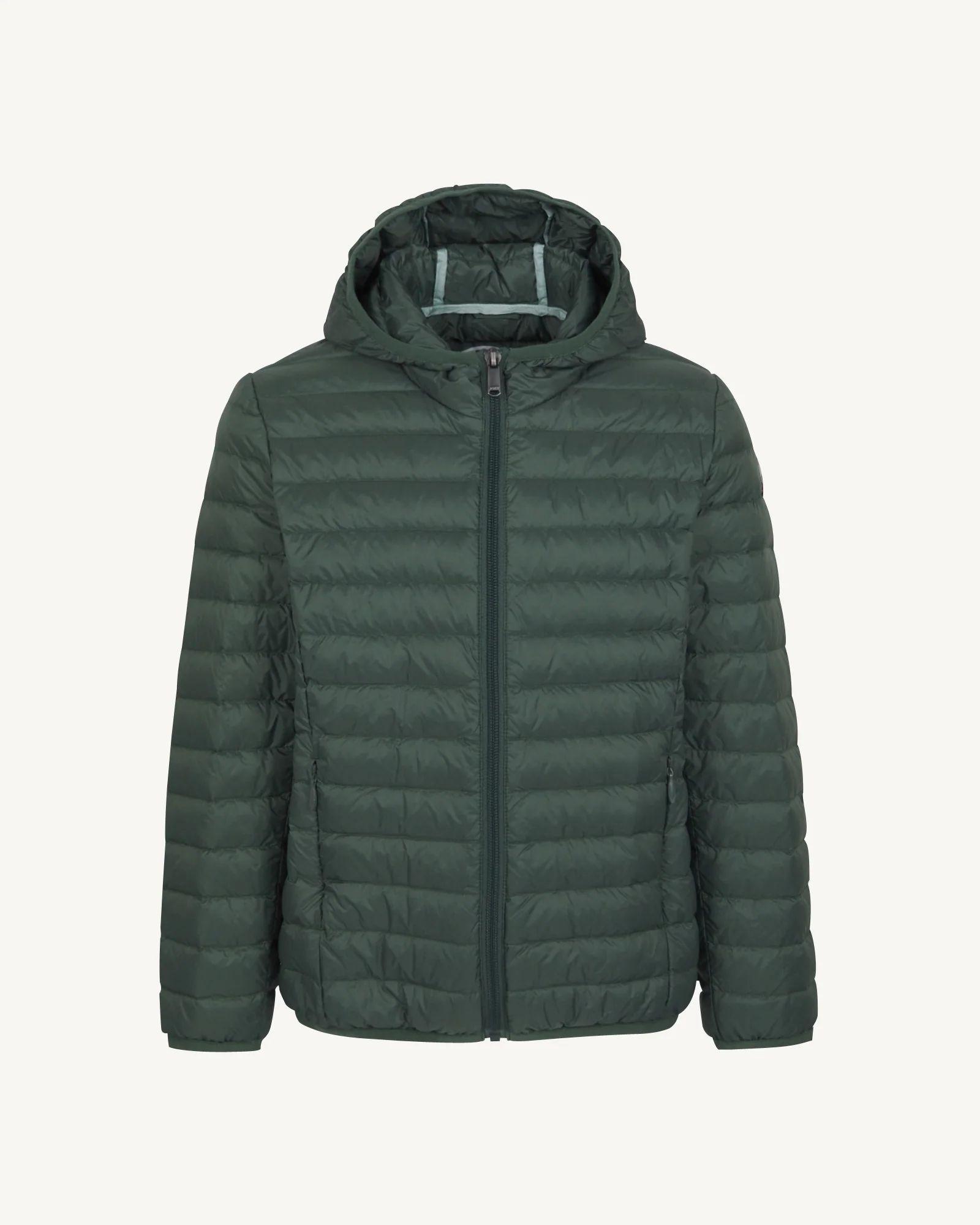 Il piumino con cappuccio Hugo è un capo perfetto per le giornate fredde. Questo piumino funzionale e casual è progettato per offrire calore e leggerezza proteggendo dall'esterno. La parte superiore e la fodera sono interamente realizzate in poliammide, garantendo resistenza e durata ottimali. Il colore verde scuro di questo piumino è ideale per attività all'aperto come escursioni o gite in città in inverno.
