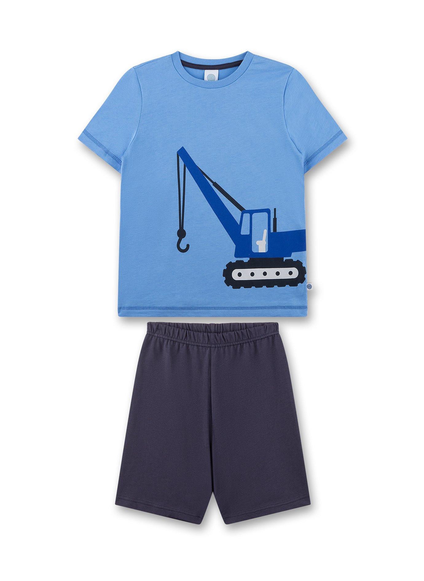 Pigiama corto da ragazzo del marchio Sanetta. T-shirt con motivo e scollo rotondo. Pigiama corto monocolore con elastico in vita.