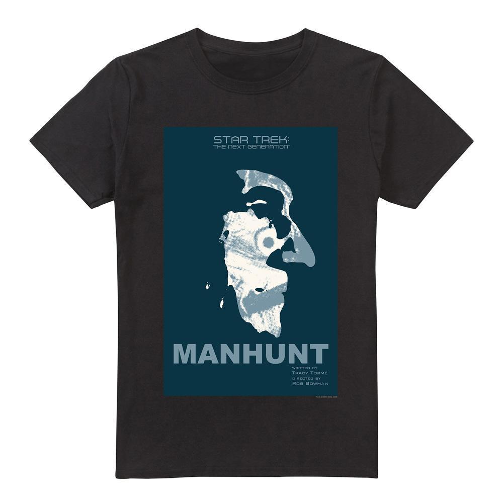 Questa T-shirt presenta una stampa grafica ispirata a "Manhunt", episodio 19 della seconda stagione di Star Trek: The Next Generation. Il design mostra una rappresentazione stilizzata di un personaggio dell'episodio su uno sfondo blu scuro, con il titolo dell'episodio ben visibile.