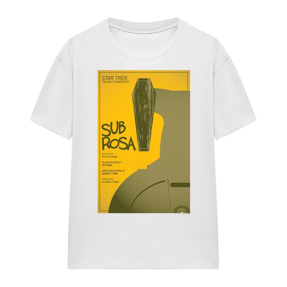Questa T-shirt presenta una stampa grafica ispirata a "Sub Rosa", stagione 7 episodio 14 di Star Trek: The Next Generation. Il design cattura l'essenza dell'episodio con un'interpretazione artistica unica.