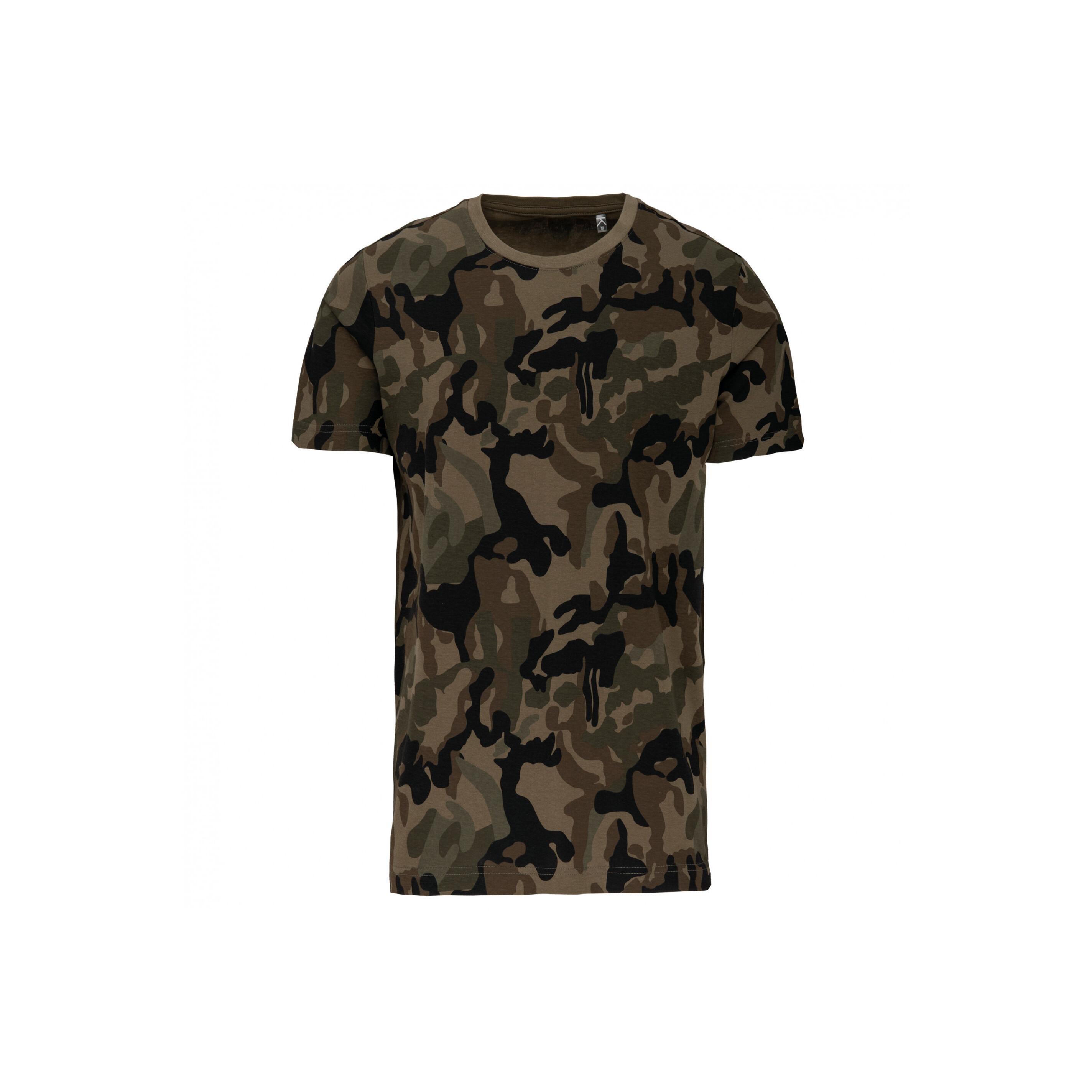 Questa t-shirt girocollo presenta un distintivo motivo mimetico, offrendo un'aggiunta versatile a qualsiasi guardaroba casual. Il suo design classico assicura una vestibilità confortevole per varie occasioni.