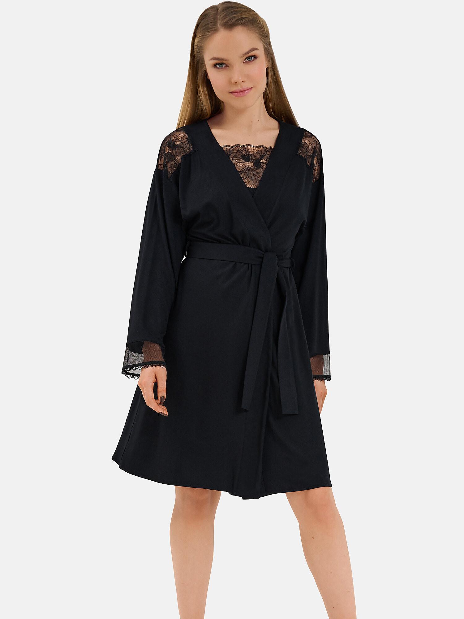 Questa vestaglia a maniche lunghe della collezione Sympathy presenta un design semplice e confortevole con un ampio bordo sulla scollatura. Le maniche sono rifinite con rete trasparente e pizzo delicato. Un ampio carré di pizzo sulla parte anteriore della spalla ne sottolinea l'eleganza. Un'ampia cintura permette la chiusura, e la lunghezza è di circa 95 cm.