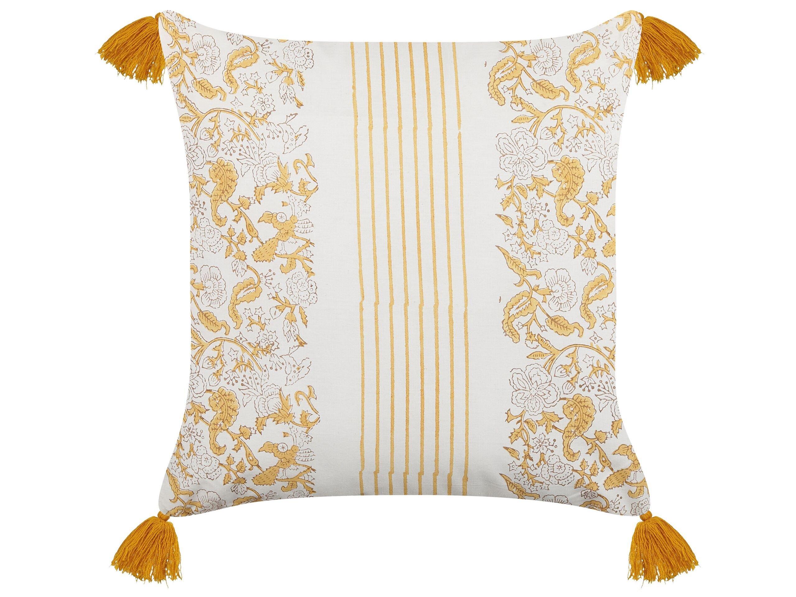 Cuscino con motivo floreale. Aggiungi un tocco di classe al salotto o alla camera da letto con questo cuscino decorativo. È realizzato in soffice cotone di altissima qualità. Il motivo floreale con strisce geometriche e nappe decorative ne fa un vero colpo d'occhio. La spessa imbottitura offre il massimo comfort.
