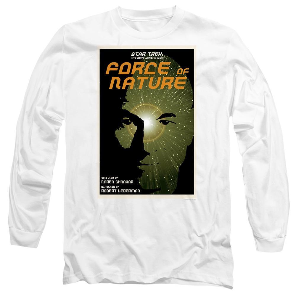 Questa T-shirt presenta una stampa grafica ispirata a "Force of Nature", Stagione 7, Episodio 9 di Star Trek: The Next Generation. Il design mostra una rappresentazione stilizzata della silhouette di un personaggio su uno sfondo cosmico, con testo che dettaglia il titolo dell'episodio, lo scrittore e il regista.