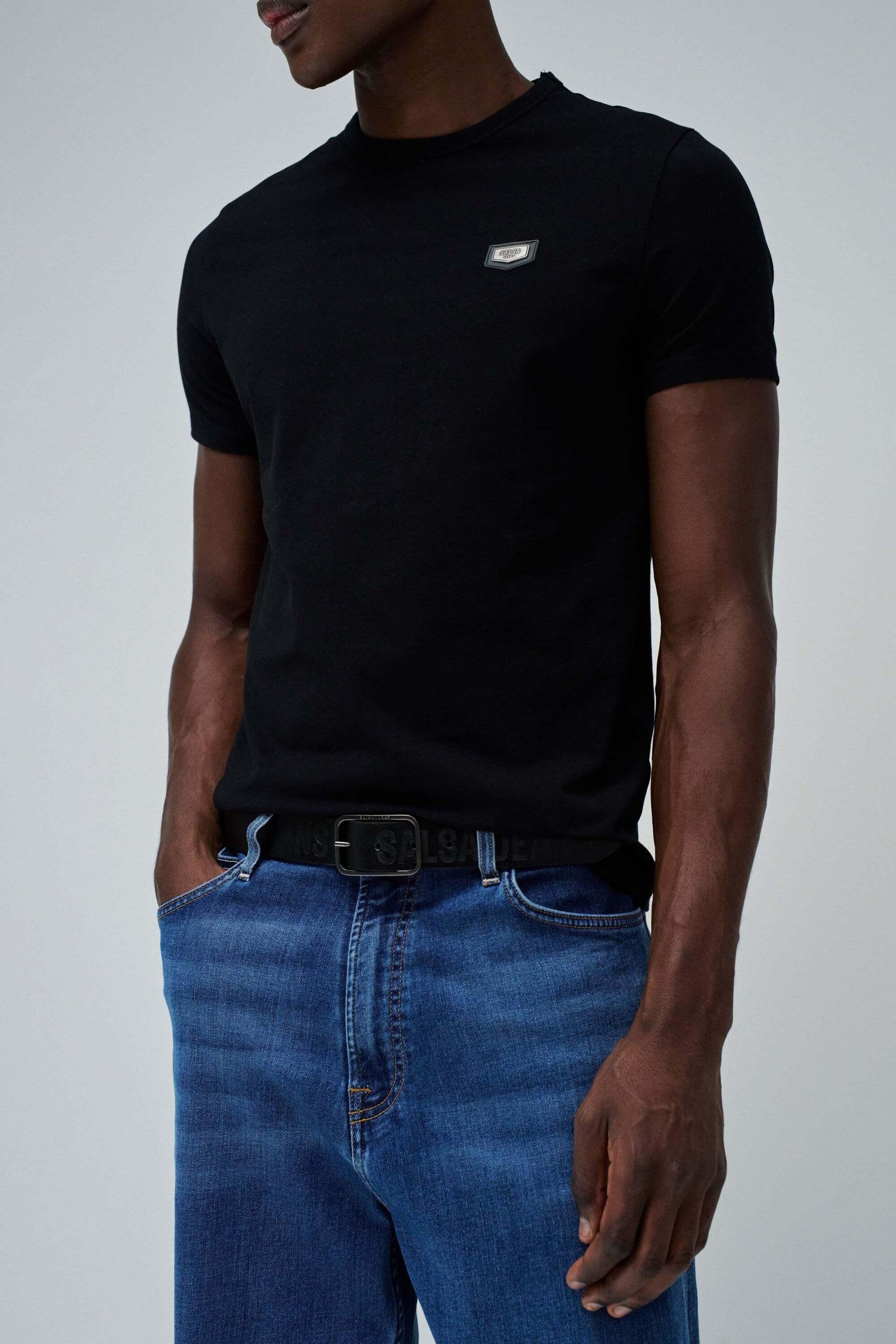 La cintura in pelle goffrata nera è un accessorio elegante con un branding discreto. Questa cintura in pelle nera presenta una fibbia metallica di alta qualità e la scritta Salsa Jeans goffrata tono su tono. È perfetta per look eleganti e casual.