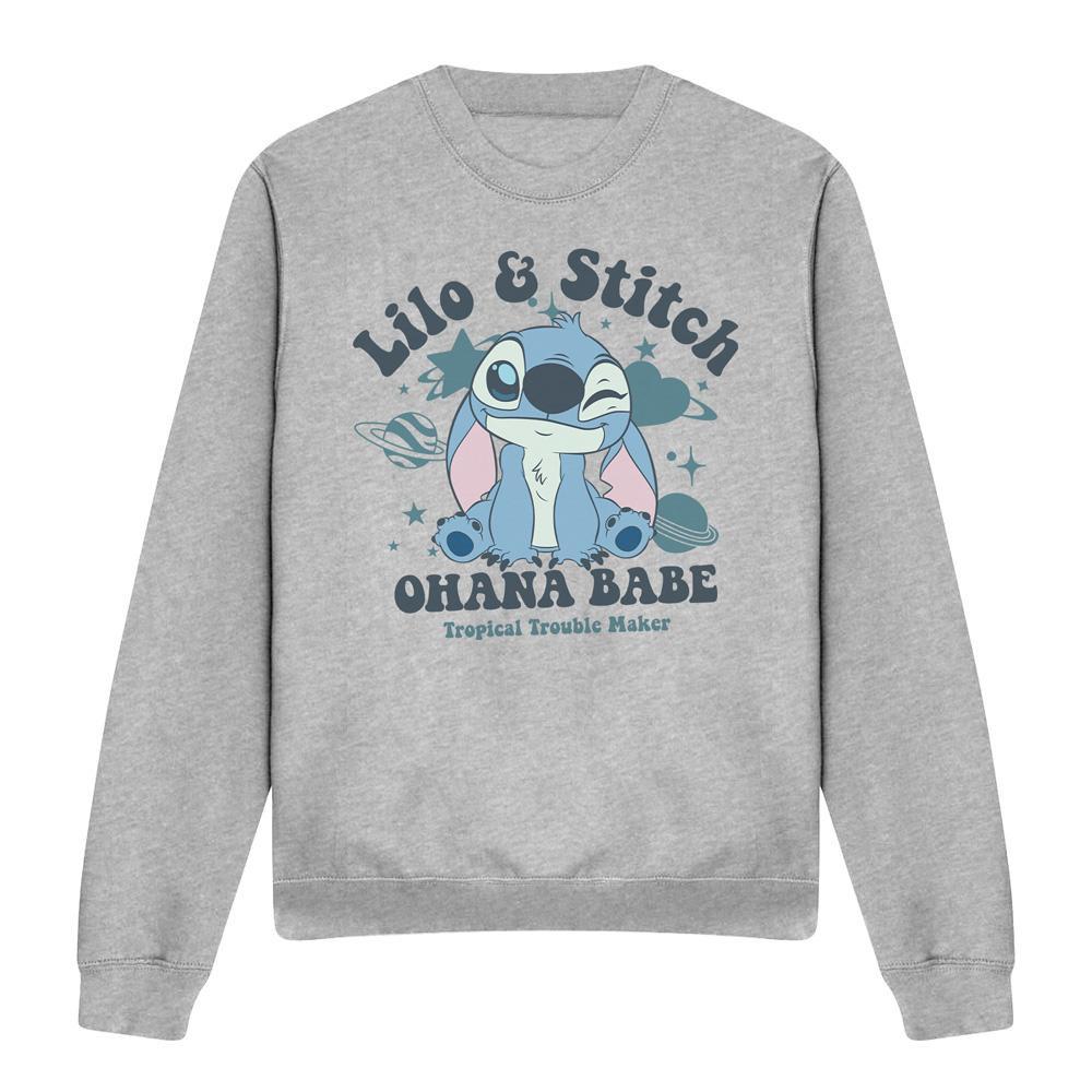 Questa felpa girocollo presenta una graziosa stampa grafica di Stitch di Lilo & Stitch, accompagnata dal testo "OHANA BABE Tropical Trouble Maker". Il design è su uno sfondo grigio chiaro, rendendola un'aggiunta versatile a qualsiasi guardaroba casual.