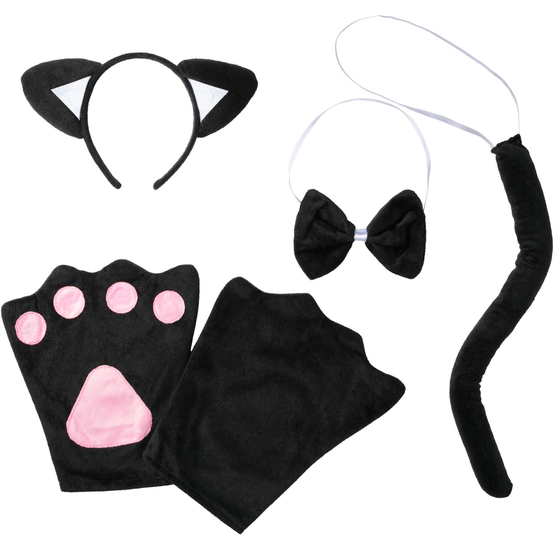 Il set di quattro accessori Gatto, unisex, per adulti, a taglia unica è in tessuto di peluche nero. Comprende un cerchietto per capelli con orecchie da gatto, come pure un paio di guanti con fodera interna rosa e applicazioni a forma di zampa. Nel set di accessori sono inoltre inclusi un papillon con nastro elasticizzato e un nastro di raso bianco applicato al centro. La coda da gatto viene pure fissata tramite nastro elasticizzato ed è corredata all'interno di un filo metallico pieghevole, che la rende modellabile a piacere. La coda da gatto come pure le orecchie da gatto sono imbottite. Materiale: 100% poliestere.