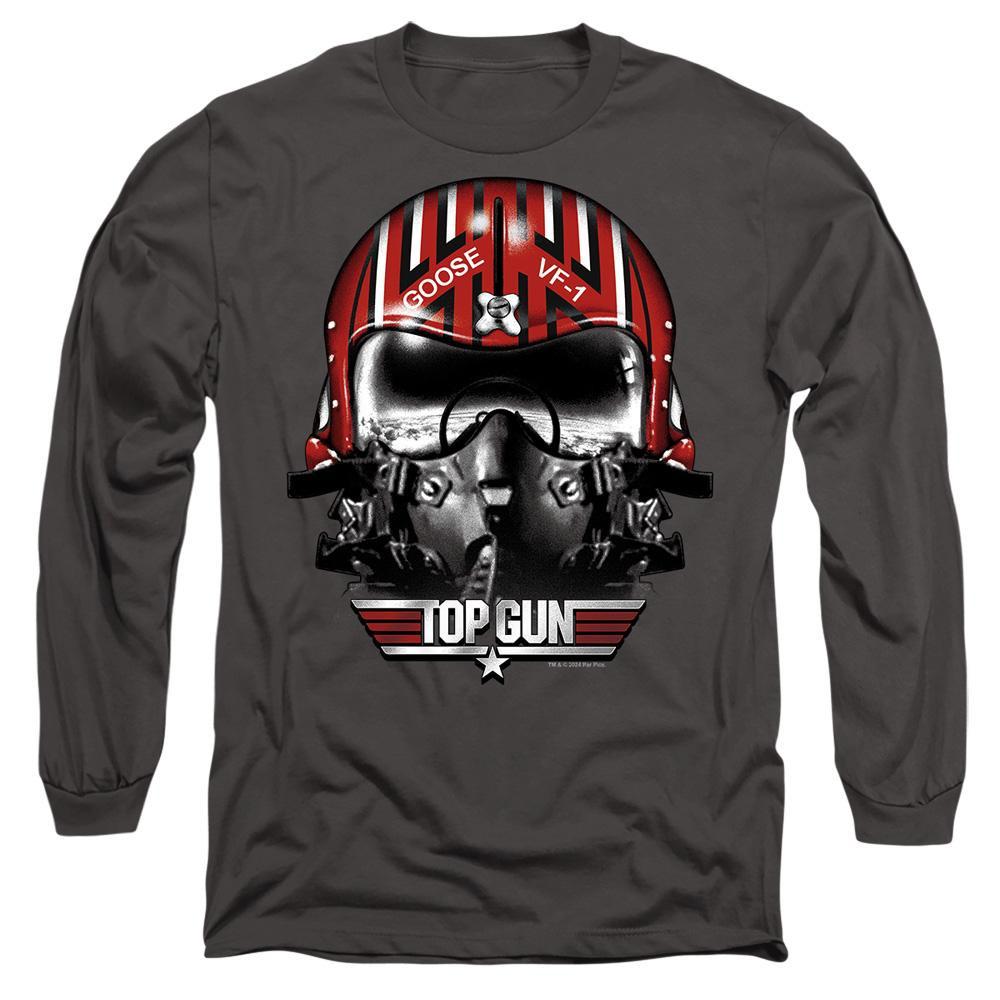 Questa t-shirt a maniche lunghe presenta una stampa grafica sorprendente ispirata all'iconico personaggio Goose di Top Gun. Il design mostra un casco da pilota con i dettagli "GOOSE" e "VF-1", su uno sfondo scuro. Questa t-shirt è una scelta comoda ed elegante per i fan del film classico.