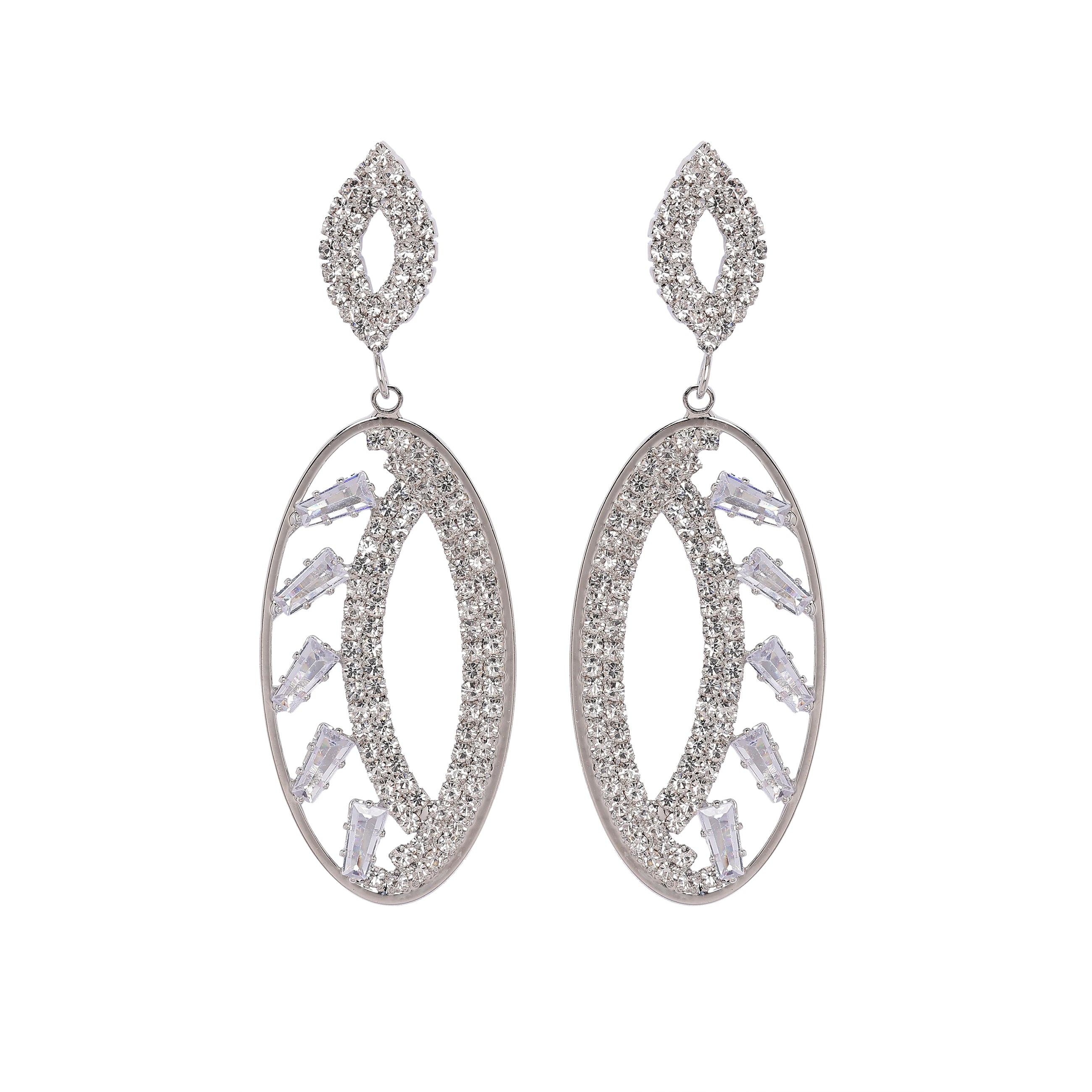 Questi orecchini sono un accattivante mix di stile moderno e classico. L'esclusivo design ovale, tempestato di una abbagliante gamma di pietre scintillanti, crea un look elegante e accattivante. Sono un pezzo distintivo che trasuda raffinatezza e fascino, perfetto per aggiungere un tocco glamour a qualsiasi outfit. Dimensioni: 2,0 cm x 6,1 cm | Placcatura: rodio | Chiusura: perno e retro