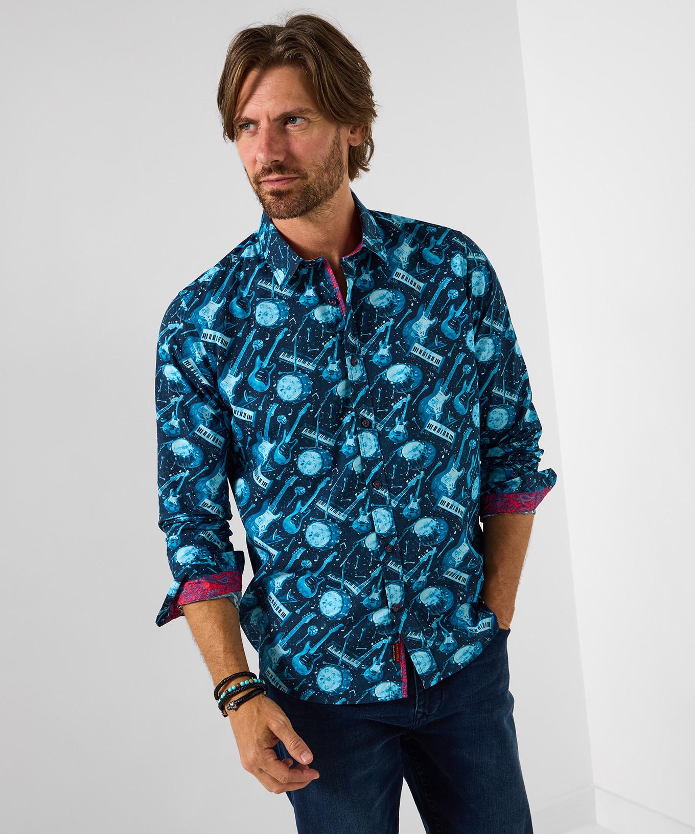 Questa camicia presenta una vivace stampa di chitarre e dettagli a contrasto sorprendenti, offrendo un look distintivo ed elegante. Il design incorpora vari strumenti musicali, creando un motivo dinamico e accattivante, perfetto per qualsiasi outfit da festa.