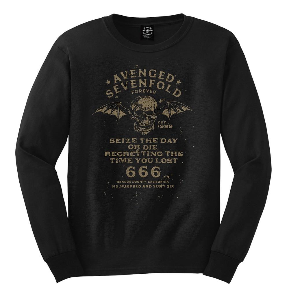 Questa t-shirt a maniche lunghe presenta una sorprendente stampa grafica ispirata al tema "Seize The Day" degli Avenged Sevenfold. Il design include un teschio con ali di pipistrello, il nome della band e la frase iconica "Seize The Day Or Die Regretting The Time You Lost".