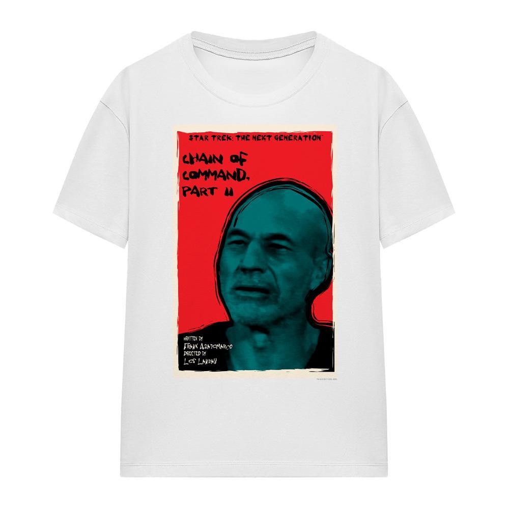 Questa T-shirt presenta una stampa grafica ispirata a "Star Trek: The Next Generation" Stagione 6, Episodio 11, intitolato "Catena di Comando, Parte II". Il design mostra un ritratto stilizzato del Capitano Jean-Luc Picard su uno sfondo rosso vibrante, catturando l'essenza dell'episodio iconico.