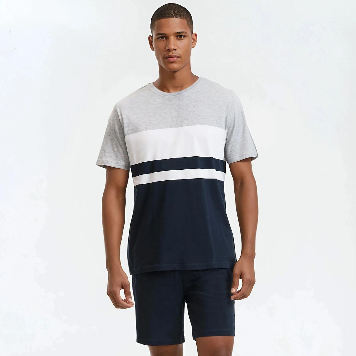 Questo pigiama corto offre comfort e stile per rilassarsi a casa. Il top presenta un design a righe, mentre i pantaloncini a tinta unita offrono una vestibilità comoda per il relax o il sonno.