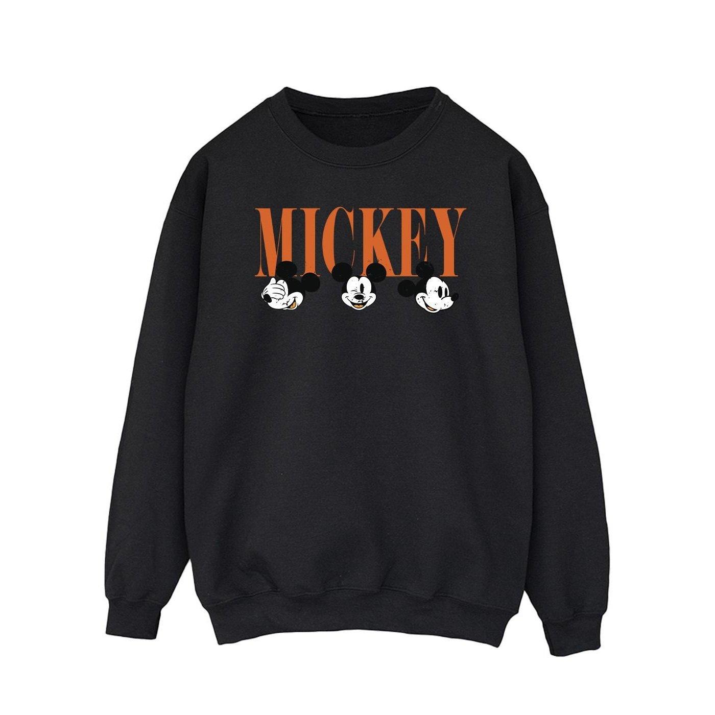 Questa felpa presenta un classico girocollo e maniche lunghe, offrendo una vestibilità comoda e rilassata. La parte anteriore è adornata con una stampa grafica della parola "MICKEY" in un carattere arancione audace, accompagnata da tre iconiche espressioni di Topolino che sbirciano da sotto. Questo design aggiunge un tocco giocoso e riconoscibile a un capo casual.