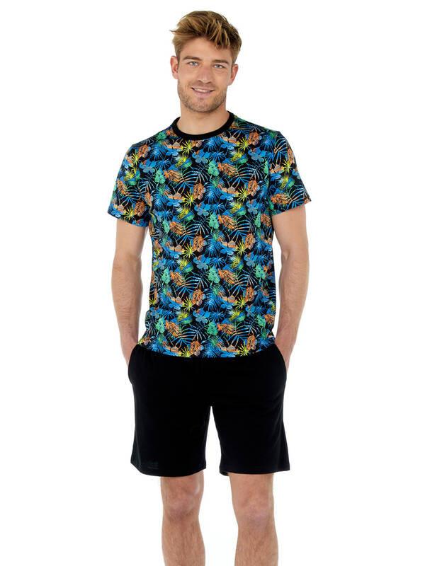 Questo set pigiama offre comfort e stile per rilassarsi a casa. La maglia a maniche corte presenta una vivace stampa tropicale all-over, mentre i pantaloncini offrono un look classico e sobrio.