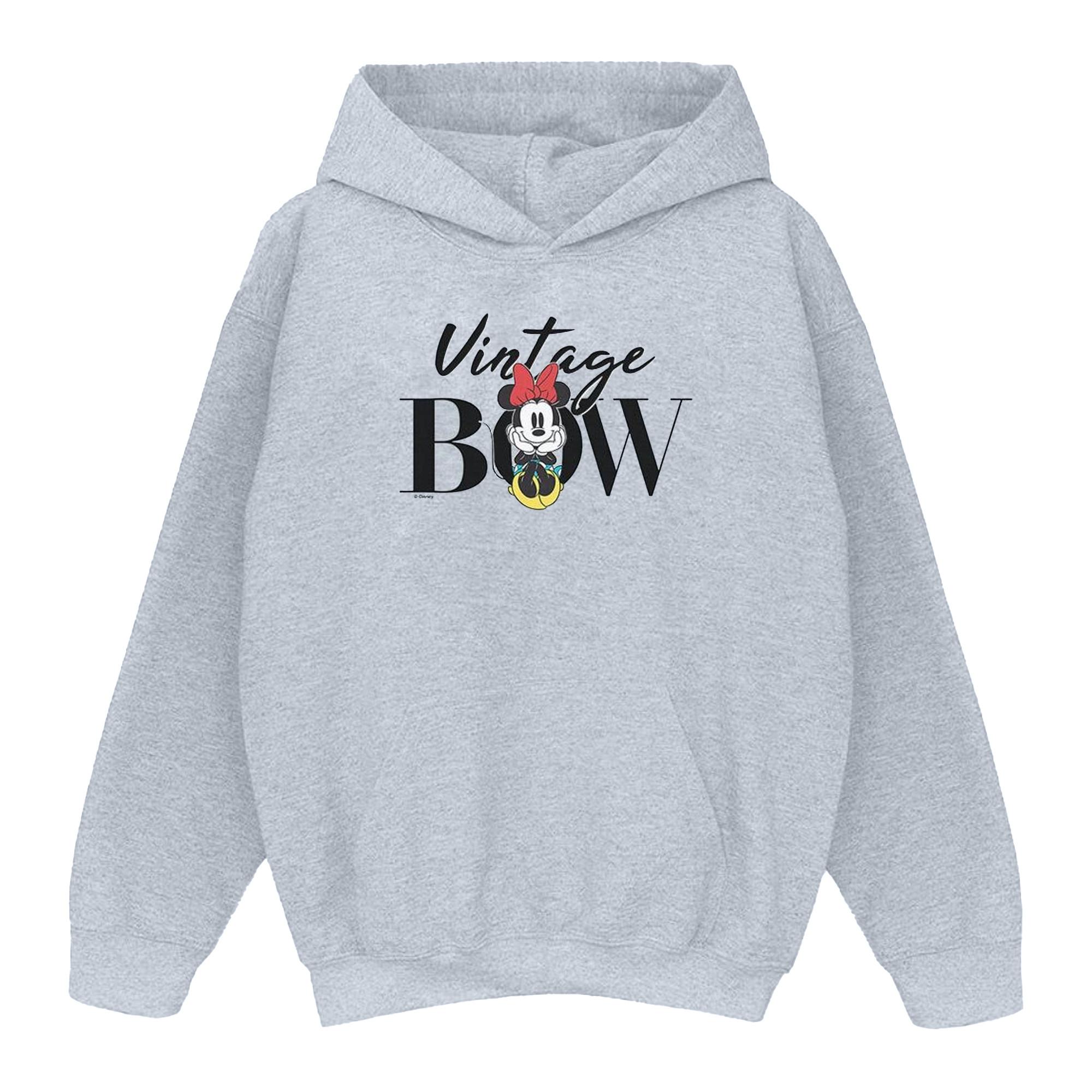 Questa felpa con cappuccio presenta una giocosa stampa di Minnie Mouse, aggiungendo un tocco di fascino vintage a un classico capo casual. Il design include il testo "Vintage BOW" con Minnie Mouse integrata nella "O", rendendolo un articolo distintivo per i fan.
