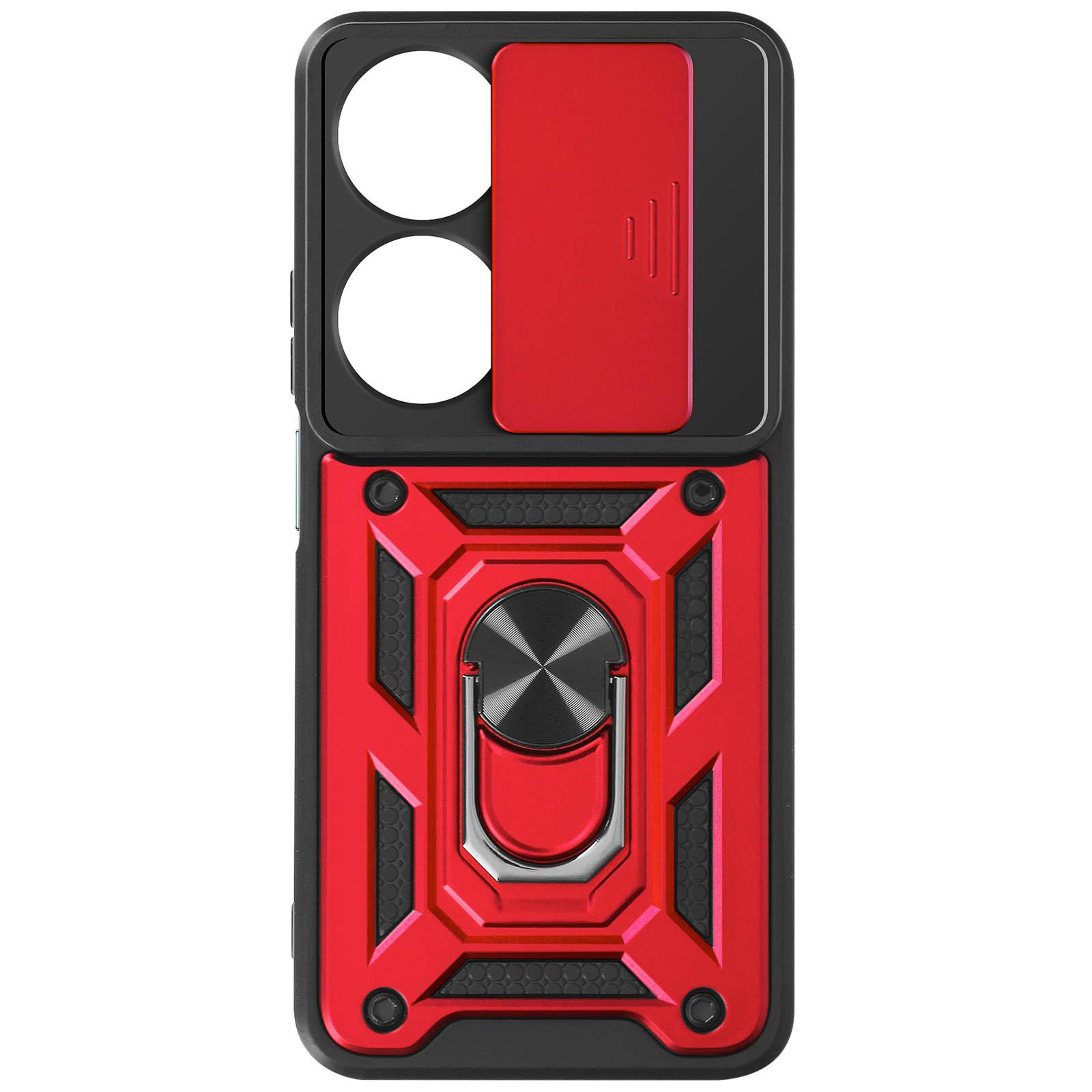 Cover bi-materiale antishock rossa con anello per proteggere il tuo [device_name] da eventuali danni Fabbricata con un mix di policarbonato e gel di silicone per resistere a urti e graffi Testata secondo lo standard MIL-STD-810G 516.6, fornisce un'ottima protezione anticaduta Il coprifotocamera a scorrimento preserva la fotocamera da urti e graffi
