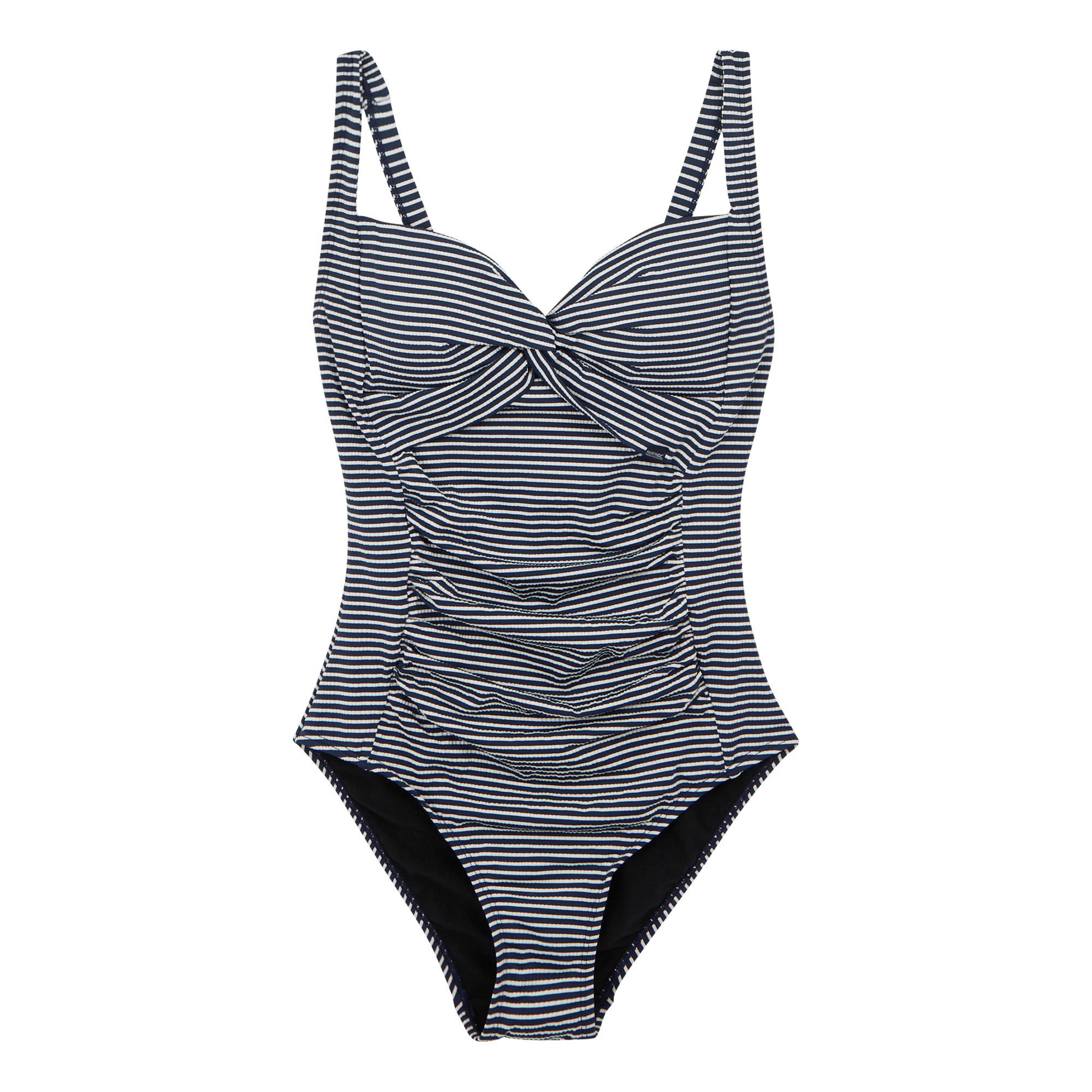 Questo costume da bagno presenta un design modellante per il controllo della pancia, offrendo una silhouette liscia. Il motivo a righe aggiunge un tocco classico, mentre il dettaglio attorcigliato sul busto valorizza l'aspetto generale.