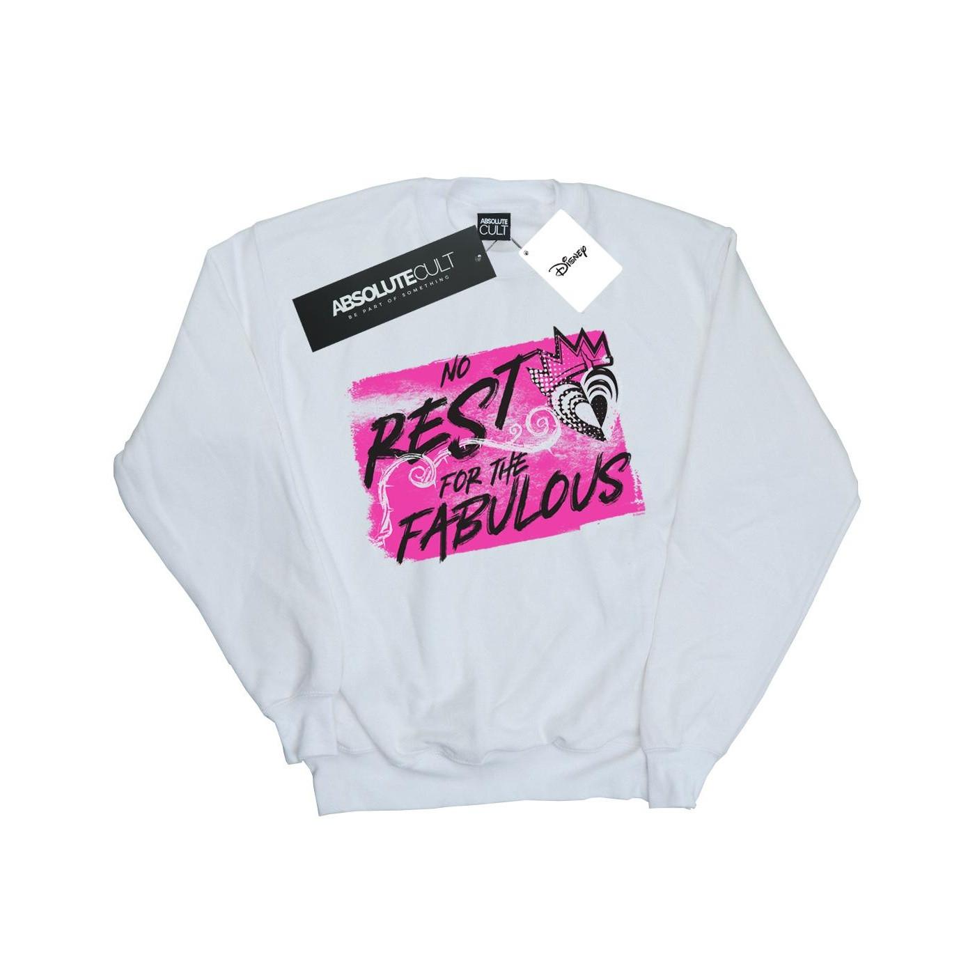 Questa felpa presenta una stampa grafica audace ispirata a The Descendants di Disney. Il design include la frase "No Rest For The Fabulous" in una vivace combinazione di colori rosa e nero, accentuata da un motivo a corona e cuore.