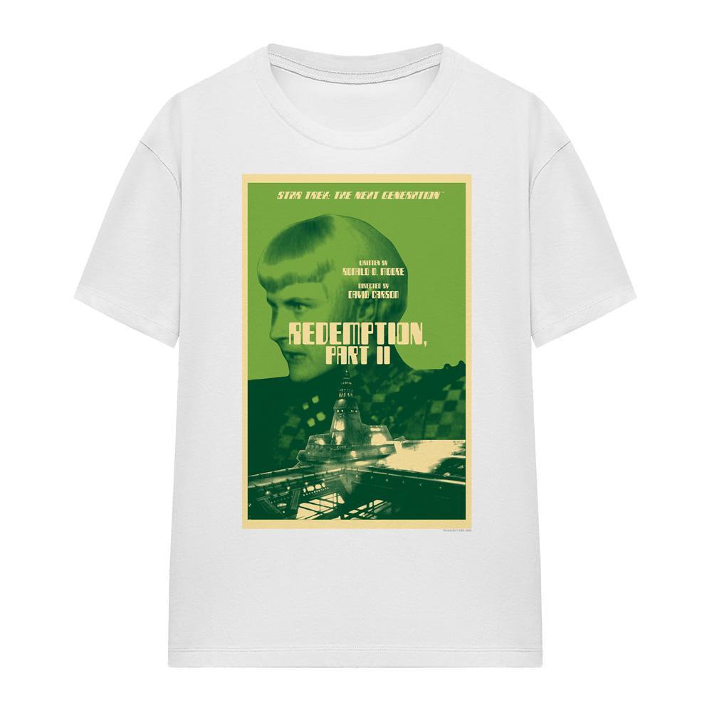 Questa T-shirt presenta una stampa grafica ispirata a "Star Trek: The Next Generation" Stagione 5, Episodio 1, intitolato "Redemption, Part II". Il design cattura l'essenza dell'iconica serie di fantascienza, rendendola un capo distintivo per i fan.