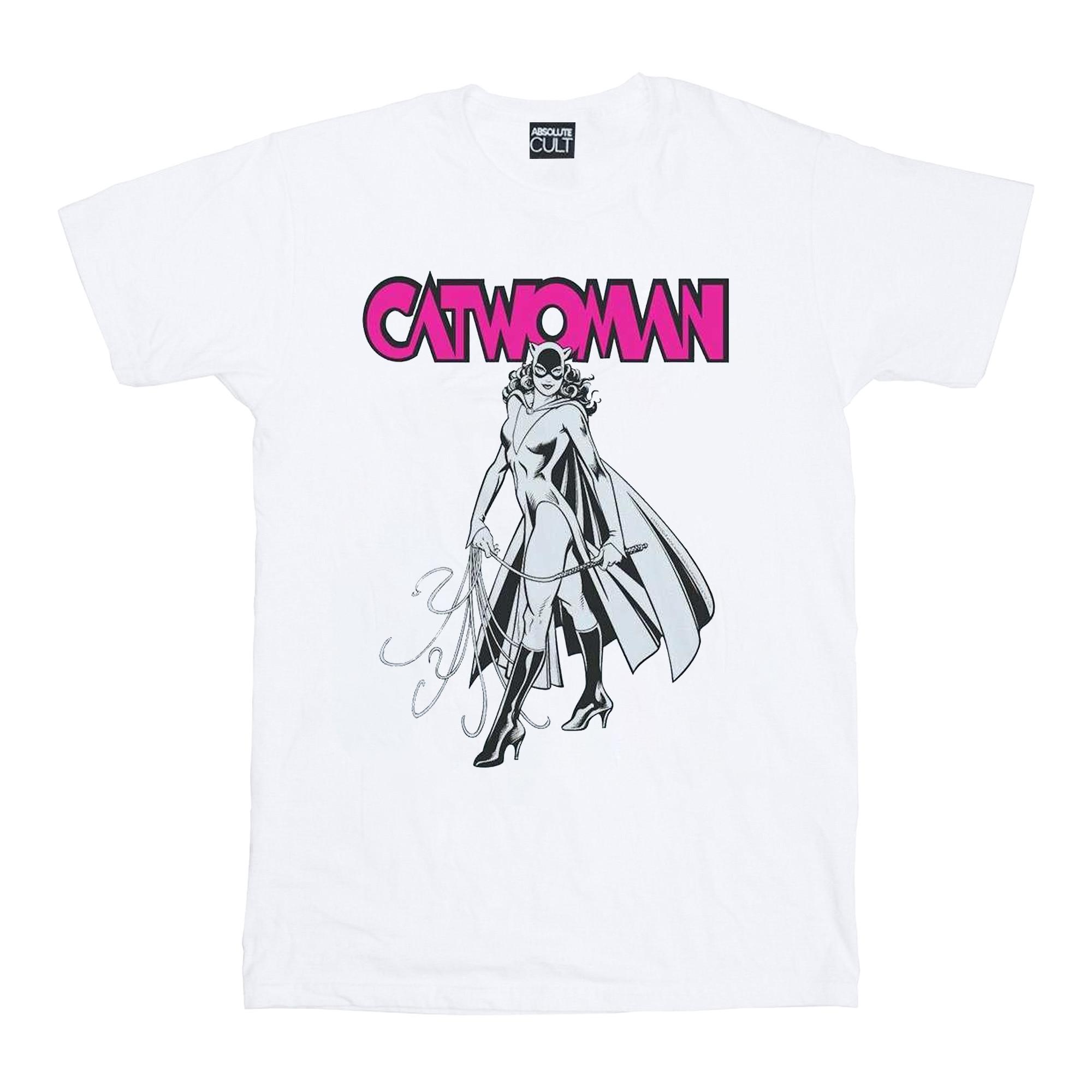 Questa T-shirt presenta una sorprendente stampa grafica di Catwoman con la sua iconica frusta, accompagnata dal logo "CATWOMAN" in grassetto rosa. Il design cattura l'essenza del classico personaggio DC Comics, rendendola un capo eccezionale per i fan.