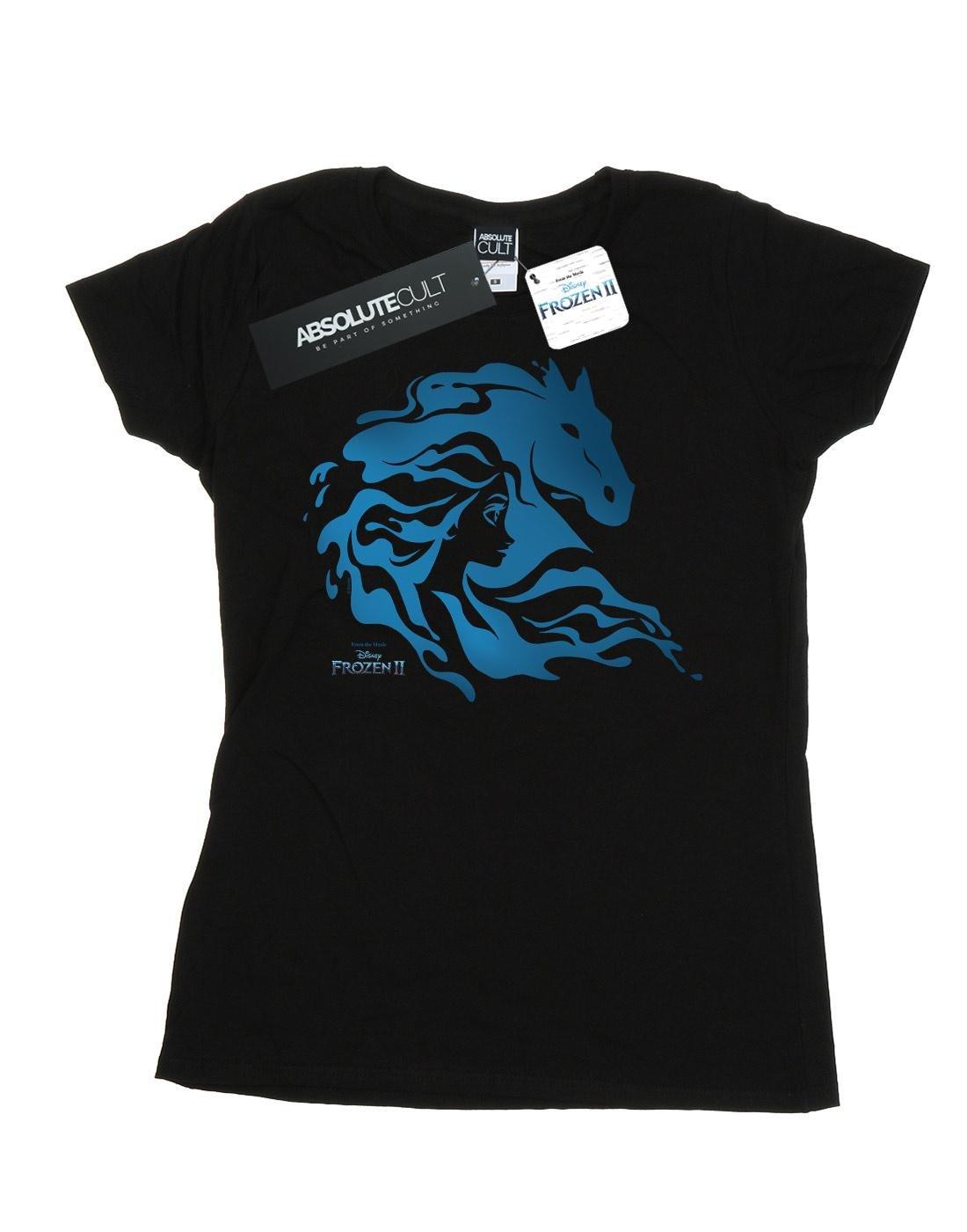 Questa T-shirt presenta una sorprendente stampa grafica ispirata a Frozen 2 della Disney. Il design mostra Elsa e il Nokk d'acqua in una dinamica silhouette blu su uno sfondo scuro, rendendola un capo accattivante per i fan del film.