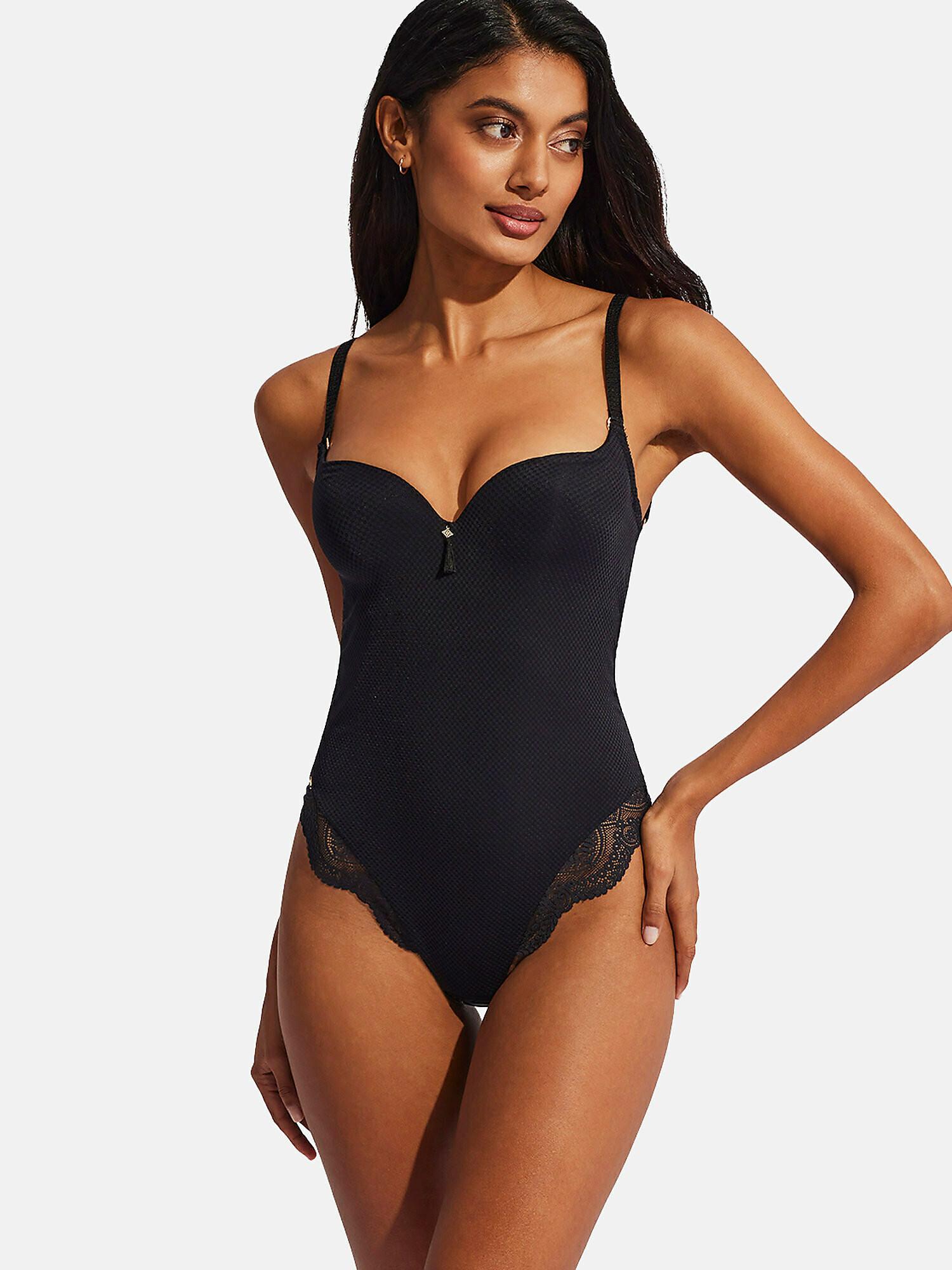 Questo body comfort preformato multifunzionale della collezione Matilda presenta un taglio brasiliano sul retro per valorizzare i glutei. Rimane invisibile per un look perfetto sotto i vestiti. Il design include delicati dettagli in pizzo con un grazioso ciondolo gioiello tra le coppe. Il davanti è foderato in tulle per un effetto leggermente modellante, che modella il corpo e centra il busto. Le spalline e la schiena sono multiposizione, in modo da poterlo adattare a tutti i vostri outfit. Le spalline sottili sono regolabili per una vestibilità perfetta. Presenta una profonda scollatura a V sulla schiena e una chiusura con gancio e occhiello sul cavallo. Un tassello in cotone garantisce un comfort intimo.