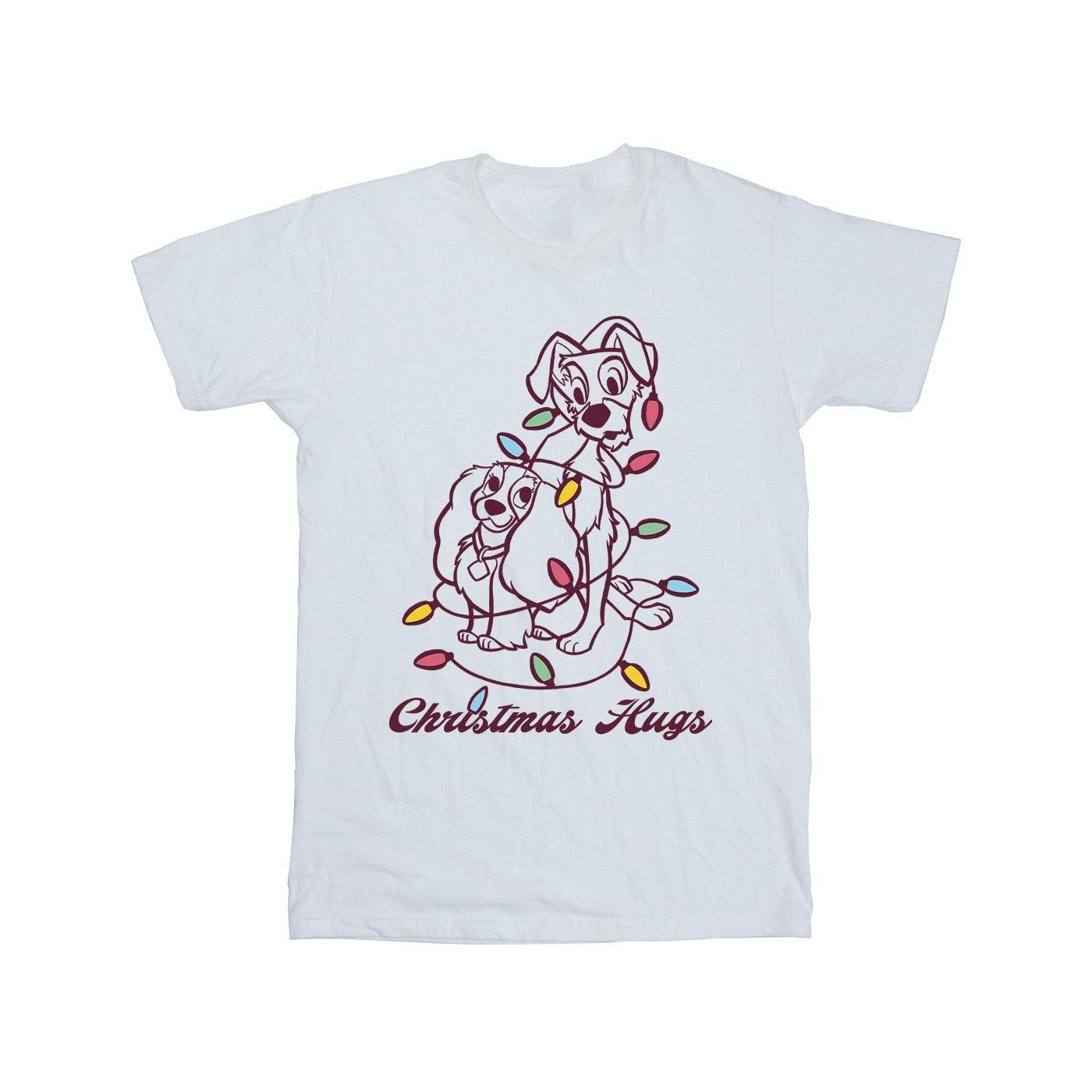 Questa T-shirt presenta una deliziosa grafica di Lilli e il Vagabondo dal classico film Disney, avvolti in luci natalizie festive, con la frase "Christmas Hugs" scritta sotto. Il design cattura un caloroso spirito natalizio, perfetto per i fan dell'amato duo canino.