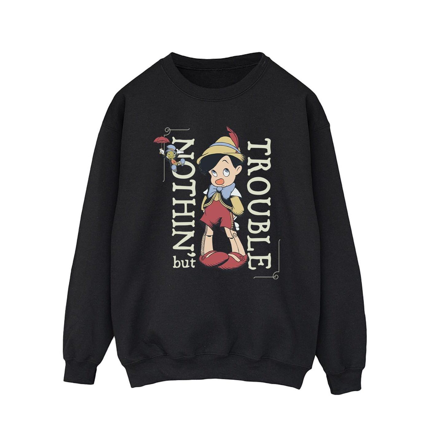 Questa felpa presenta un classico design a girocollo, offrendo un'aggiunta comoda e versatile a qualsiasi guardaroba. La parte anteriore è adornata con una stampa grafica di Pinocchio, accompagnata dal testo "NOTHIN' but TROUBLE", che aggiunge un tocco giocoso e distintivo. Questo prodotto Disney con licenza ufficiale è realizzato in tessuto jersey.