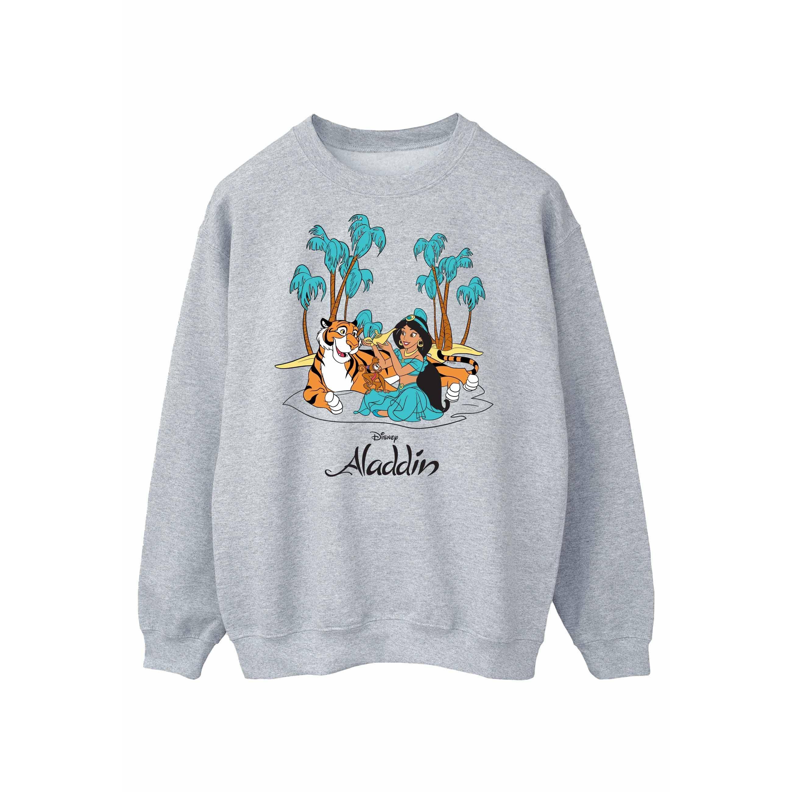 Questa felpa presenta un'incantevole stampa grafica ispirata ad Aladdin della Disney, che mostra la Principessa Jasmine e Rajah in un ambiente rilassato con palme. Il classico design a girocollo e la comoda vestibilità regolare la rendono un'aggiunta versatile a qualsiasi guardaroba casual.
