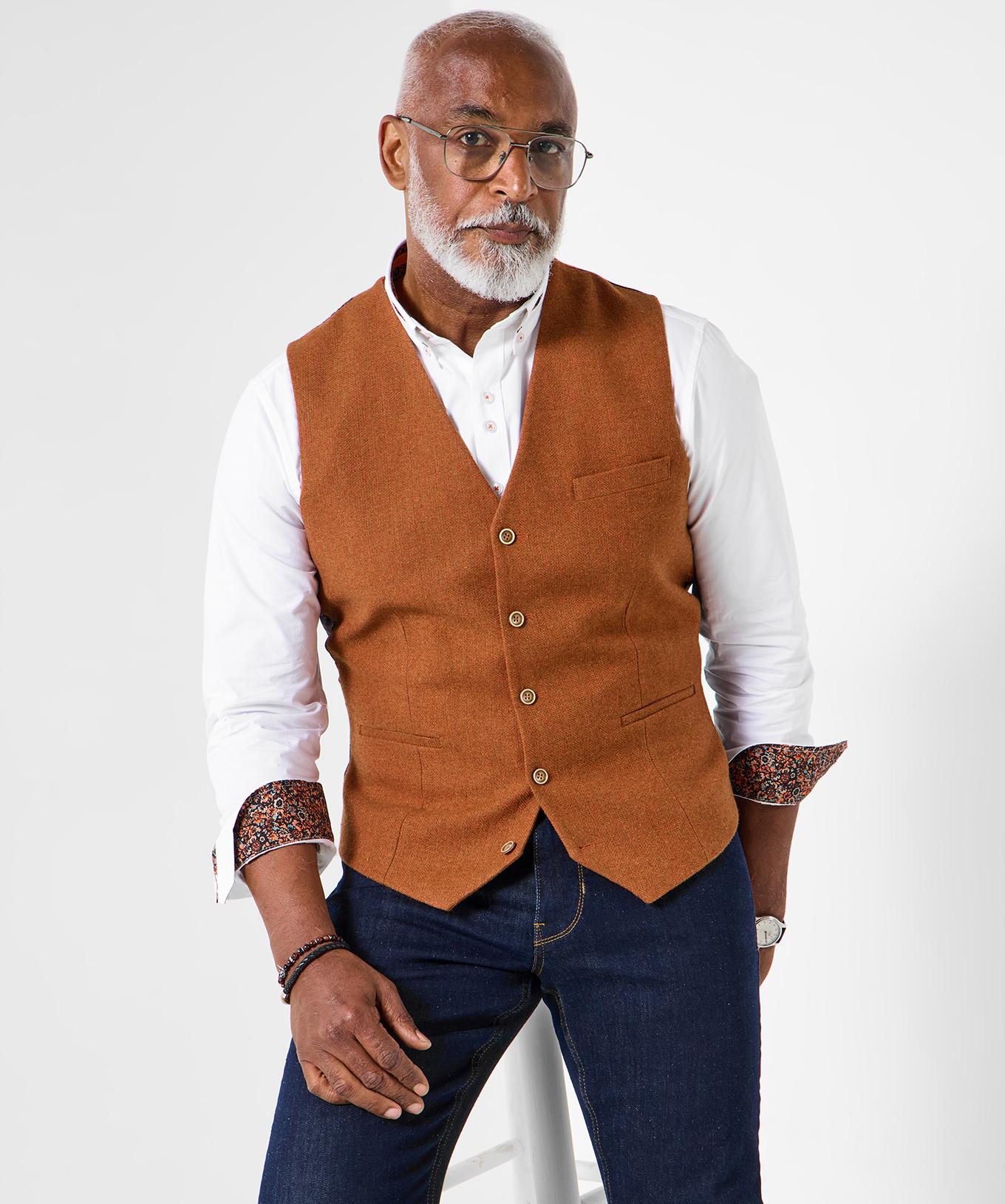 Questo gilet classico presenta un design intramontabile con un tocco moderno. Il colore ricco e caldo e la texture sottile lo rendono un'aggiunta versatile a qualsiasi guardaroba, perfetto da indossare sopra una camicia per un look raffinato.