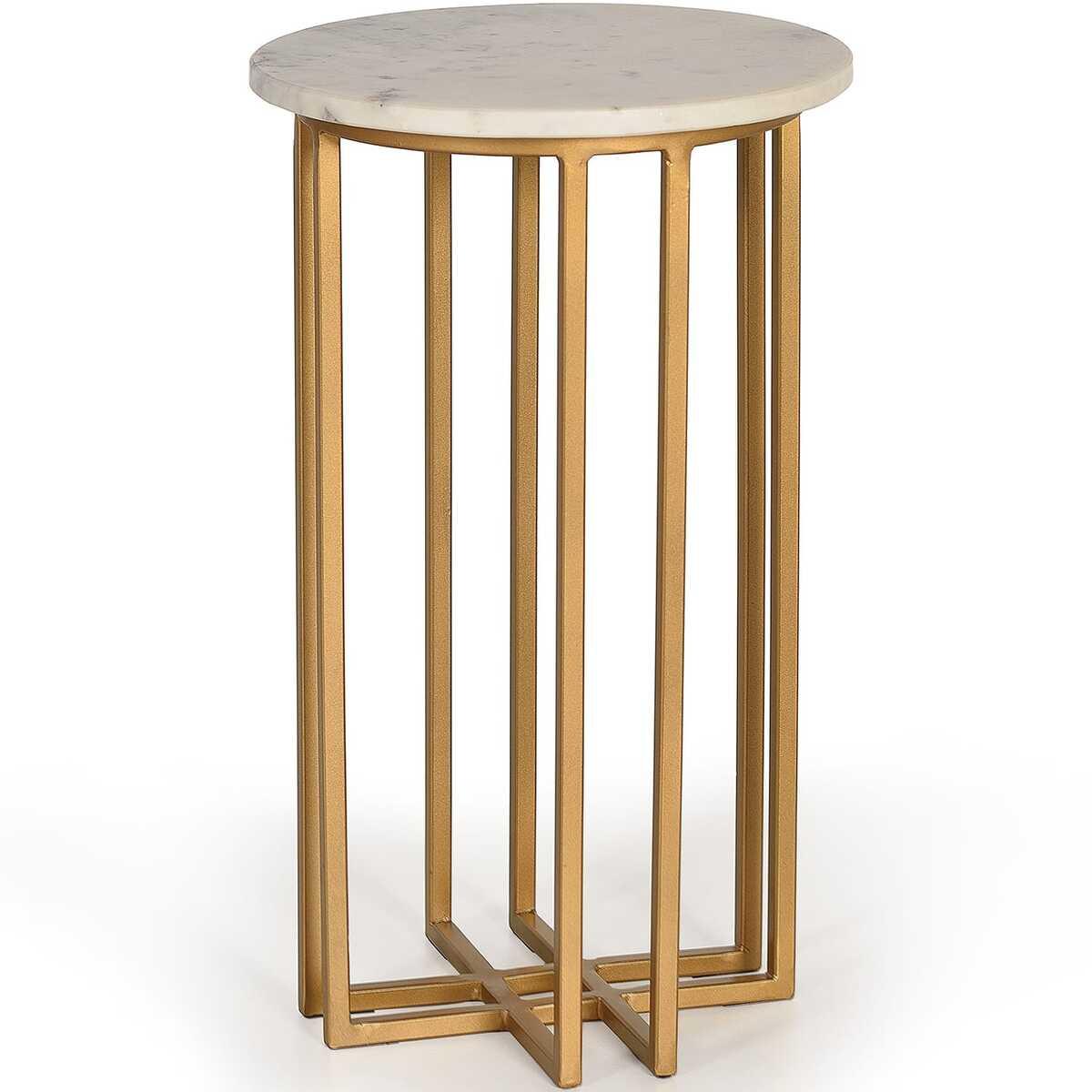 Tavolino con piano in marmo e base in metallo. Rotondo, diametro 30 cm, altezza 50 cm.