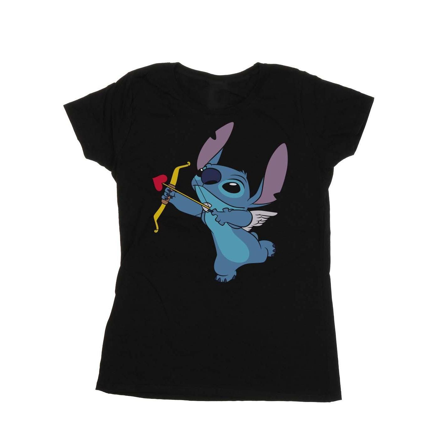 Questa maglietta presenta una grafica giocosa di Stitch nei panni di Cupido, completa di ali e arco e frecce, rendendola una scelta affascinante per San Valentino o qualsiasi altro giorno. Il classico girocollo e le maniche corte offrono una vestibilità comoda e versatile.