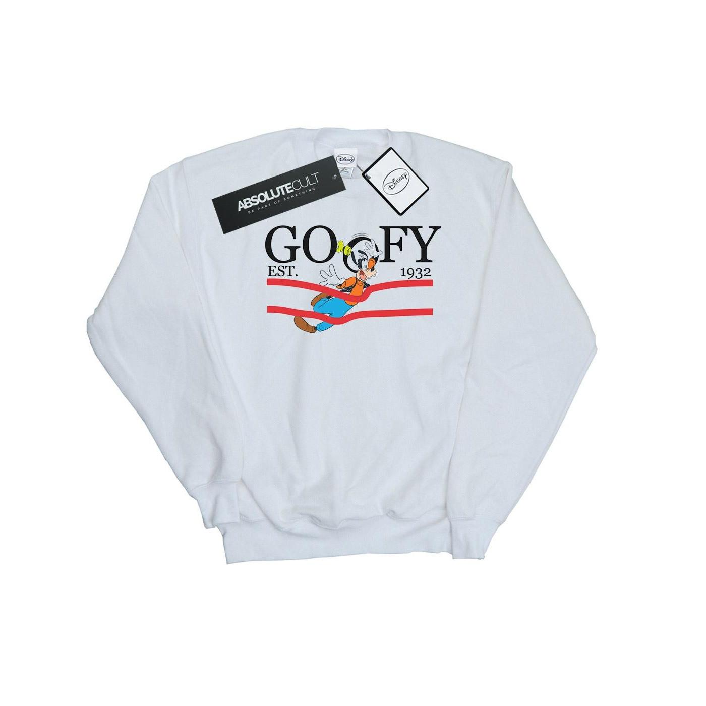 Questa felpa presenta un classico design a girocollo e una divertente stampa grafica di Pippo della Disney. Il design include il testo "GOOFY EST. 1932" con strisce rosse, aggiungendo un tocco vintage al capo. È un'opzione comoda ed elegante per l'abbigliamento casual.
