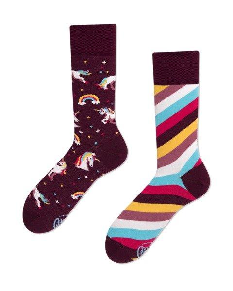 I calzini The Unicorn offrono un'aggiunta giocosa e vivace a qualsiasi guardaroba. Questo paio presenta due design distinti: un calzino mostra un incantevole motivo di unicorno e arcobaleno su uno sfondo bordeaux intenso, mentre l'altro calzino presenta un vivace motivo a righe in colori complementari. Questi calzini sono progettati per portare un tocco di fantasia e colore all'abbigliamento quotidiano.