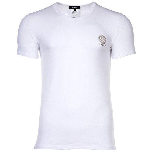 Questa T-shirt presenta una vestibilità aderente e un classico scollo a V, offrendo un look moderno ed elegante. La parte anteriore è adornata con l'iconico logo Versace Medusa e il nome del marchio, aggiungendo un tocco di lusso.