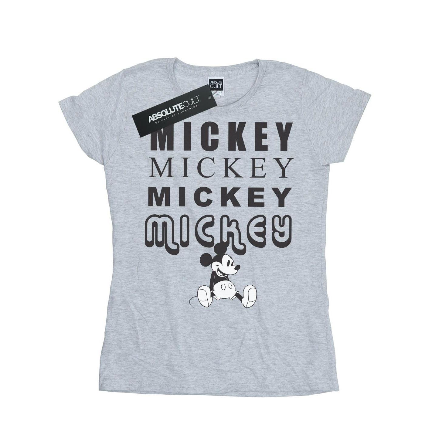 Questa t-shirt Disney Mickey Mouse con licenza ufficiale presenta un classico girocollo e maniche corte. Il design mostra una giocosa ripetizione del nome "Mickey" con l'iconico personaggio seduto sotto.