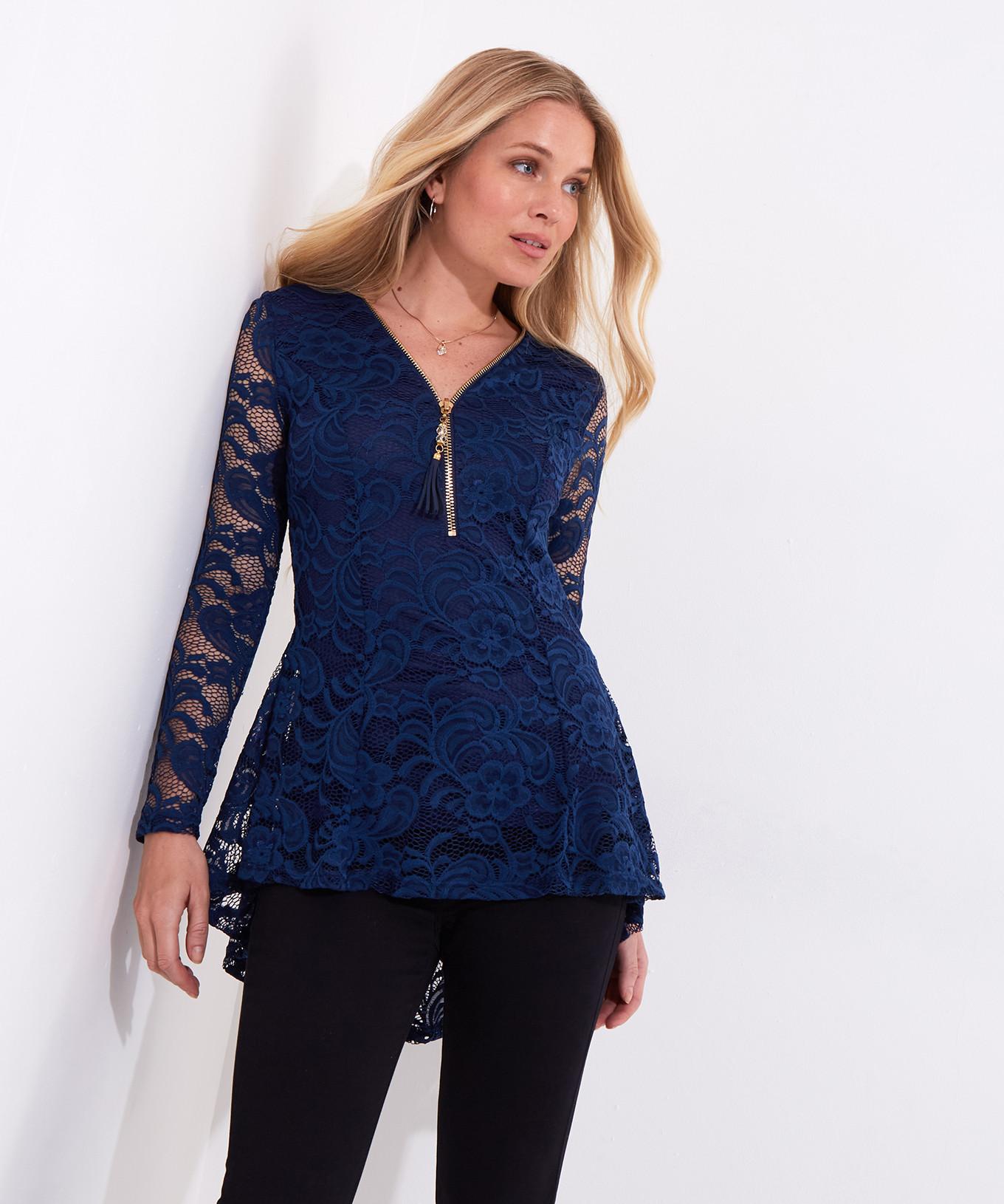 Questo top slim in pizzo presenta un design sofisticato con scollo a cerniera e una chiusura a cerniera decorativa. Le maniche lunghe sono realizzate in pizzo delicato, aggiungendo un tocco elegante al capo. Il top ha una silhouette lusinghiera che si allarga delicatamente verso l'orlo, creando una vestibilità elegante e confortevole.