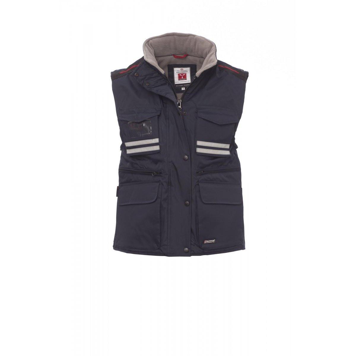 Questo gilet da donna presenta un taglio ergonomico e una cerniera in plastica da 8 mm con cursore in metallo, completa di patta e bottoni in plastica. Il cappuccio sagomato è staccabile e/o ripiegabile nel colletto. È dotato di profili riflettenti grigi sul davanti e sul retro, uno spacco laterale a soffietto con cerniera e nove tasche esterne, di cui due LOCK SYSTEM, due con cerniera e interno rinforzato, e una con porta badge reversibile. L'interno è imbottito con micropile su colletto, schiena e scaldareni, coulisse in vita e cerniera interna per facilitare stampe e ricami.