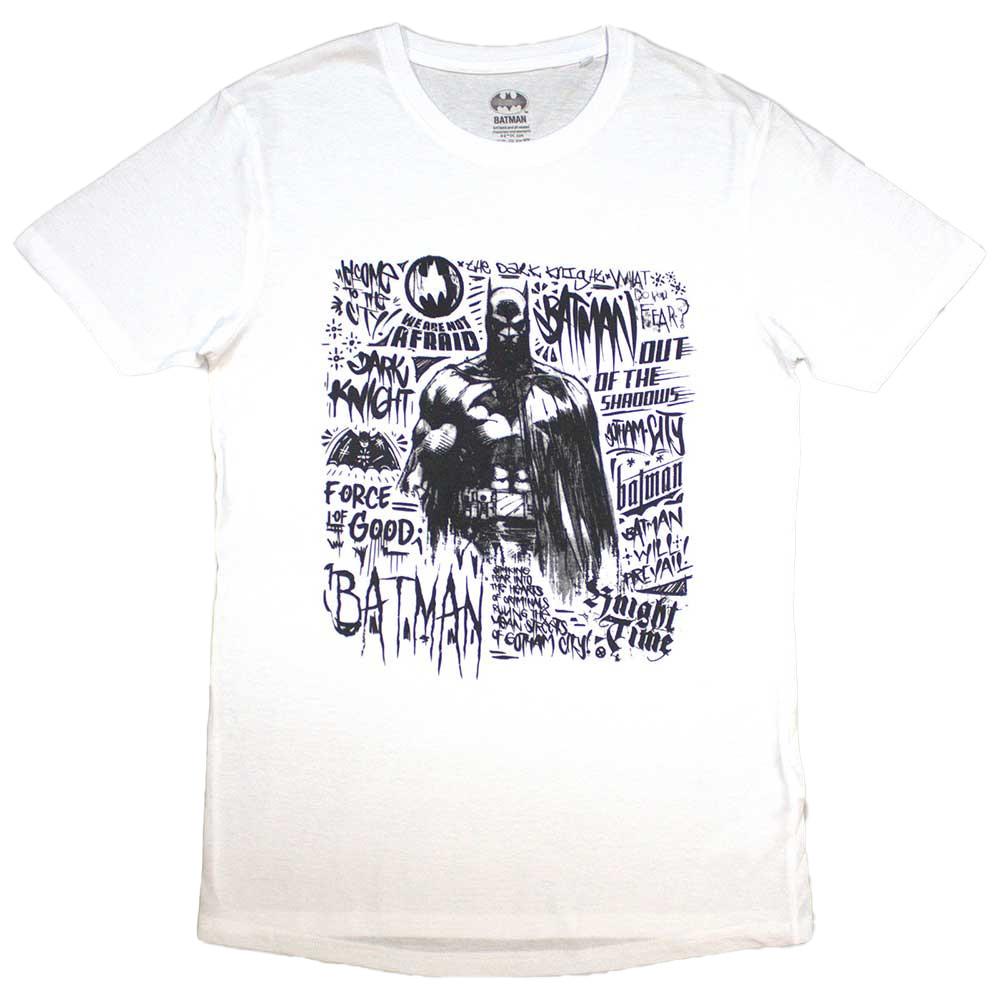 Questa T-shirt presenta una sorprendente stampa grafica di Batman circondato da testo scarabocchiato e simboli iconici di Batman. Il design cattura l'essenza del Cavaliere Oscuro con un tocco artistico unico, rendendola un capo eccezionale per i fan.