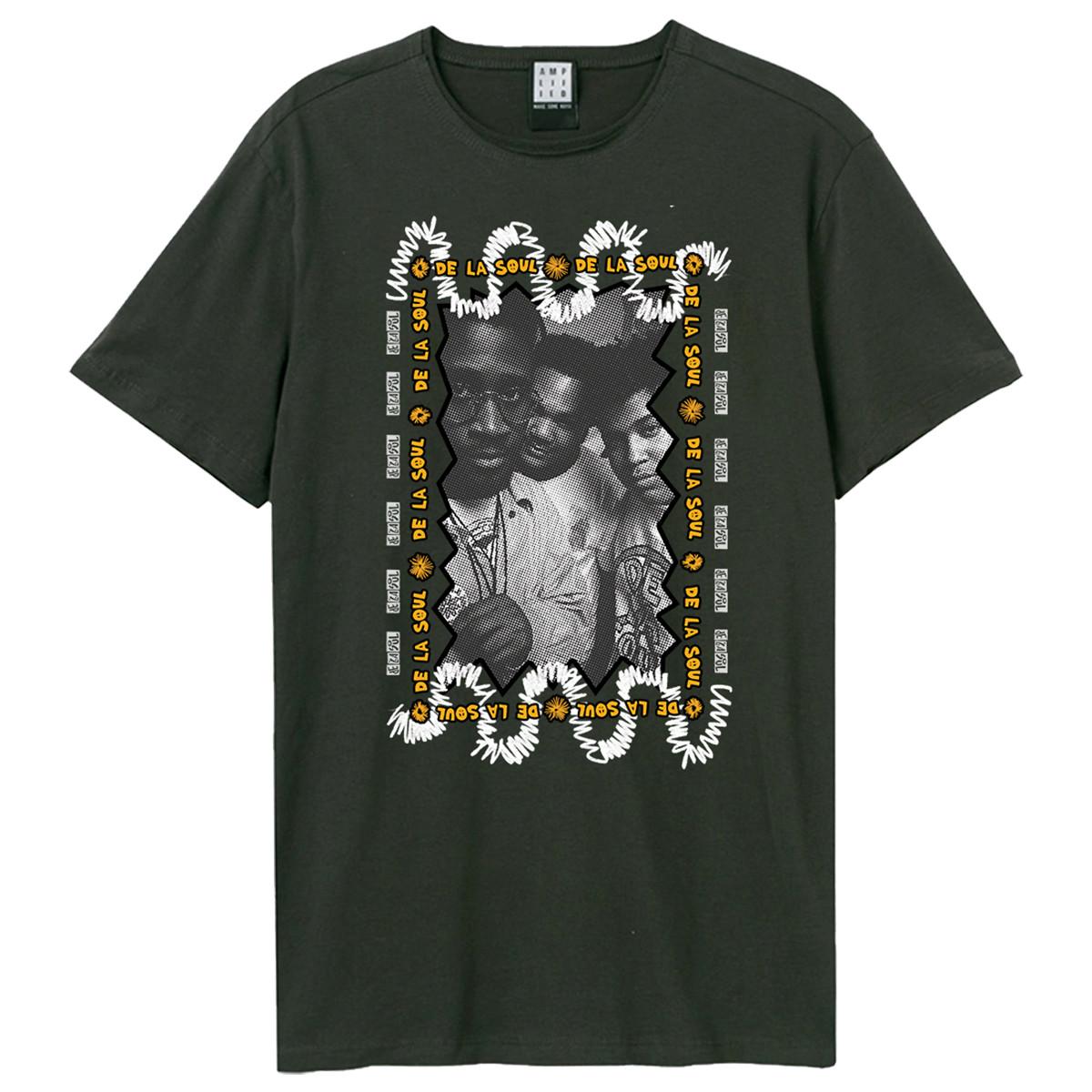 Questa T-shirt presenta una sorprendente stampa grafica sul davanti, che mostra una foto in bianco e nero incorniciata da un bordo decorativo. Il bordo include elementi testuali come "DE LA SOUL" e motivi floreali, aggiungendo un tocco unico al design. Il classico girocollo e le maniche corte la rendono un'aggiunta versatile a qualsiasi guardaroba.
