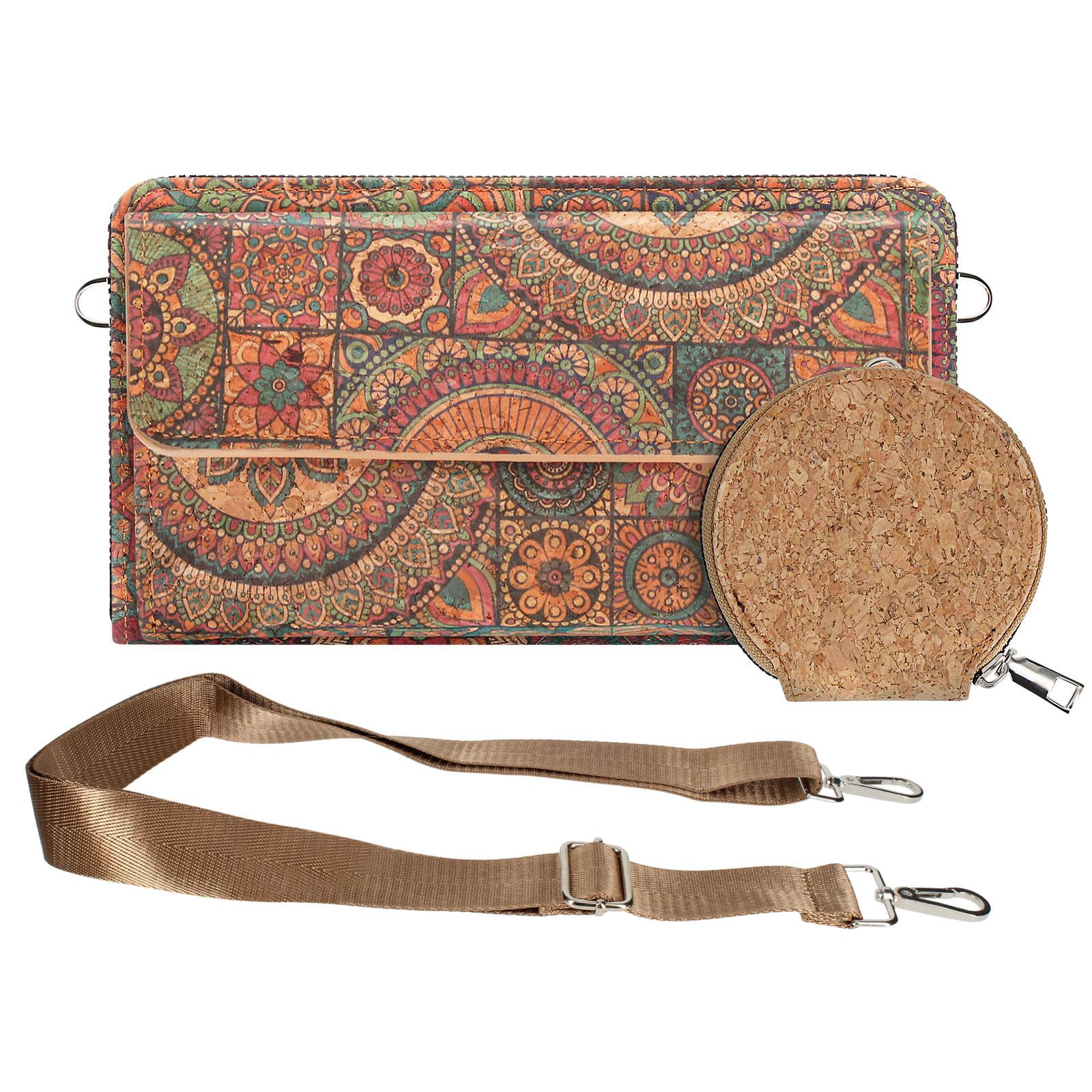 Questa pochette per telefono CorkArt è realizzata in tessuto di sughero, offrendo un accessorio unico ed ecologico. Presenta un motivo vivace e intricato che aggiunge un tocco artistico a qualsiasi outfit. La borsa è progettata per contenere in modo sicuro un telefono e altri piccoli oggetti essenziali, rendendola una scelta pratica per l'uso quotidiano. Un portamonete è incluso.