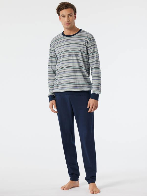 Questo pigiama offre comfort e stile per rilassarsi a casa. Il set include una maglia a maniche lunghe con un motivo a righe sottili e pantaloni a tinta unita, entrambi progettati con polsini per una vestibilità aderente.
